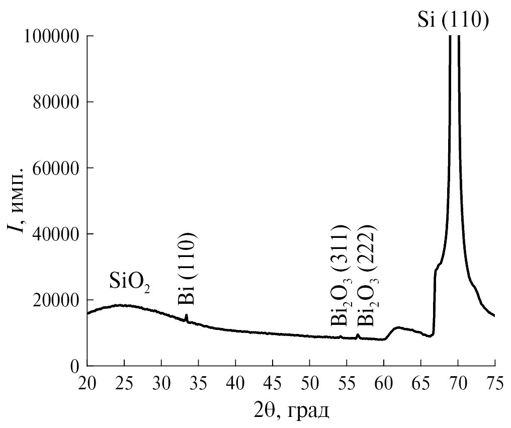 Дифрактограмма образца с конденсированными нанокристаллами при времени осаждения 20 с свидетельствует о наличии Bi, оксидов Bi2O3 и SiO2 и их ориентации на поверхности подложки Si(110) (рис. 2). Вероятно, оксиды на поверхности подложек образовались вследствие атмосферного воздействия при их хранении.