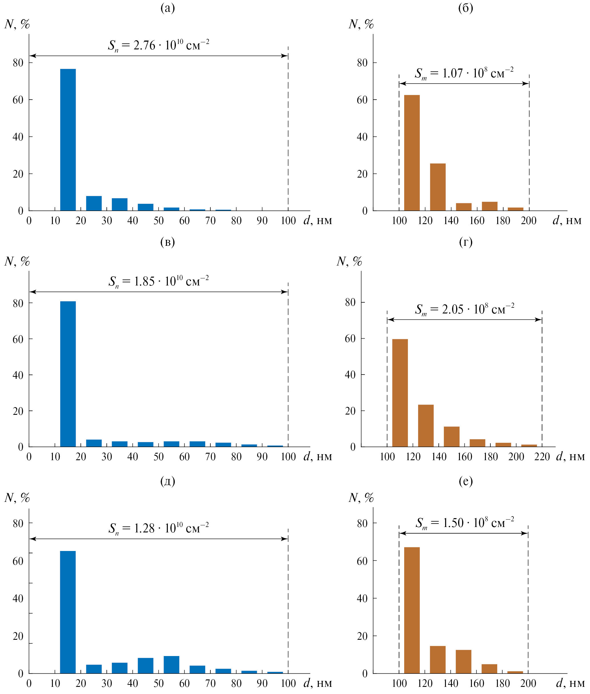 Рис. 3. Относительное количество (N) нано- и микрокристаллов Bi при времени осаждения: а, б – 10, в, г – 15, д, е – 20 с.