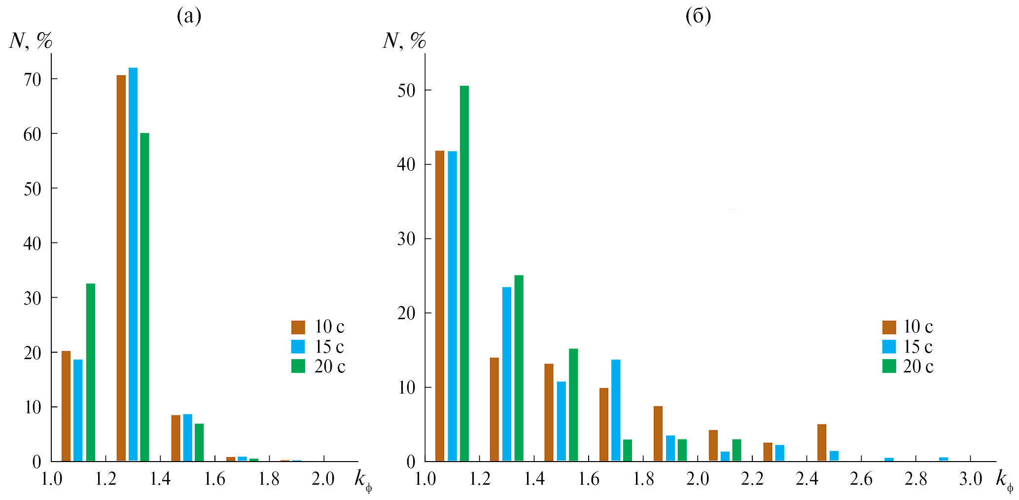 Рис. 4. Зависимость относительного количества (N) нанокристаллов (а) и микрокристаллов (б) Bi от коэффициента формы kф.