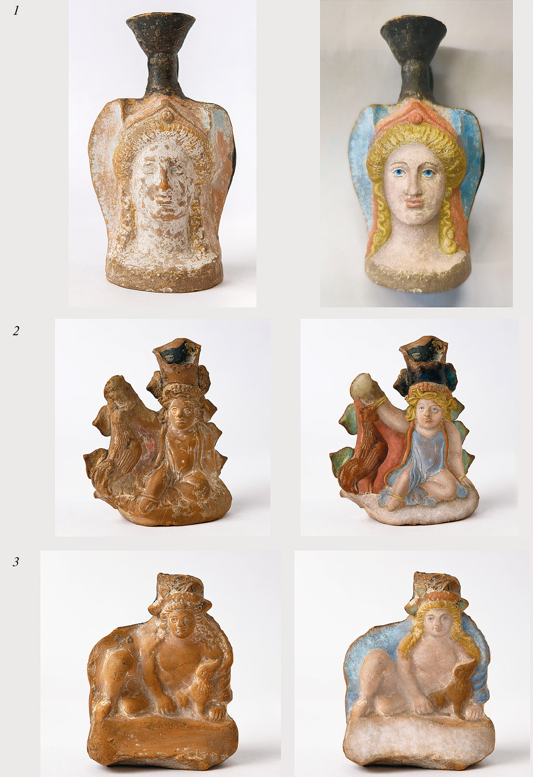 Так, в архаический и классический периоды для окраски волос применяли черный пигмент, иногда им же окантовывали края одежды [6, p. 45, 10, p. 49, 18]. Красной и коричневой краской выделяли хитон и покрывало, отдельные детали лица и атрибуты [6, p. 45. № 11, p. 58. № 27]. Палитра эллинистического периода стала пастельной, в ней превалировали нежно-голубой, розовый и лиловый оттенки [6, p. 246. Fig. 79].
