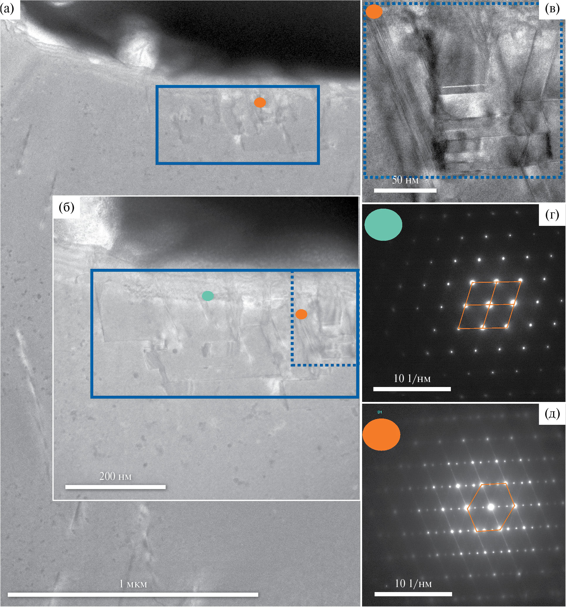 Рис. 2. ПЭМ-изображения области лазерно-индуцированного микрократера: а – общий вид, темные области сверху характерны для аморфного кремния, косые линии на рисунках – дислокации решетки; б, в – увеличенные области, отмеченные прямоугольниками на рис. а; г, д – картины электронной дифракции от областей, отмеченных точками.