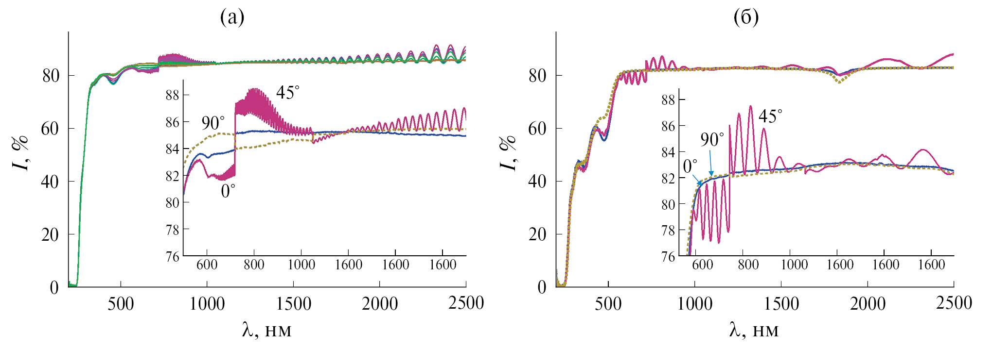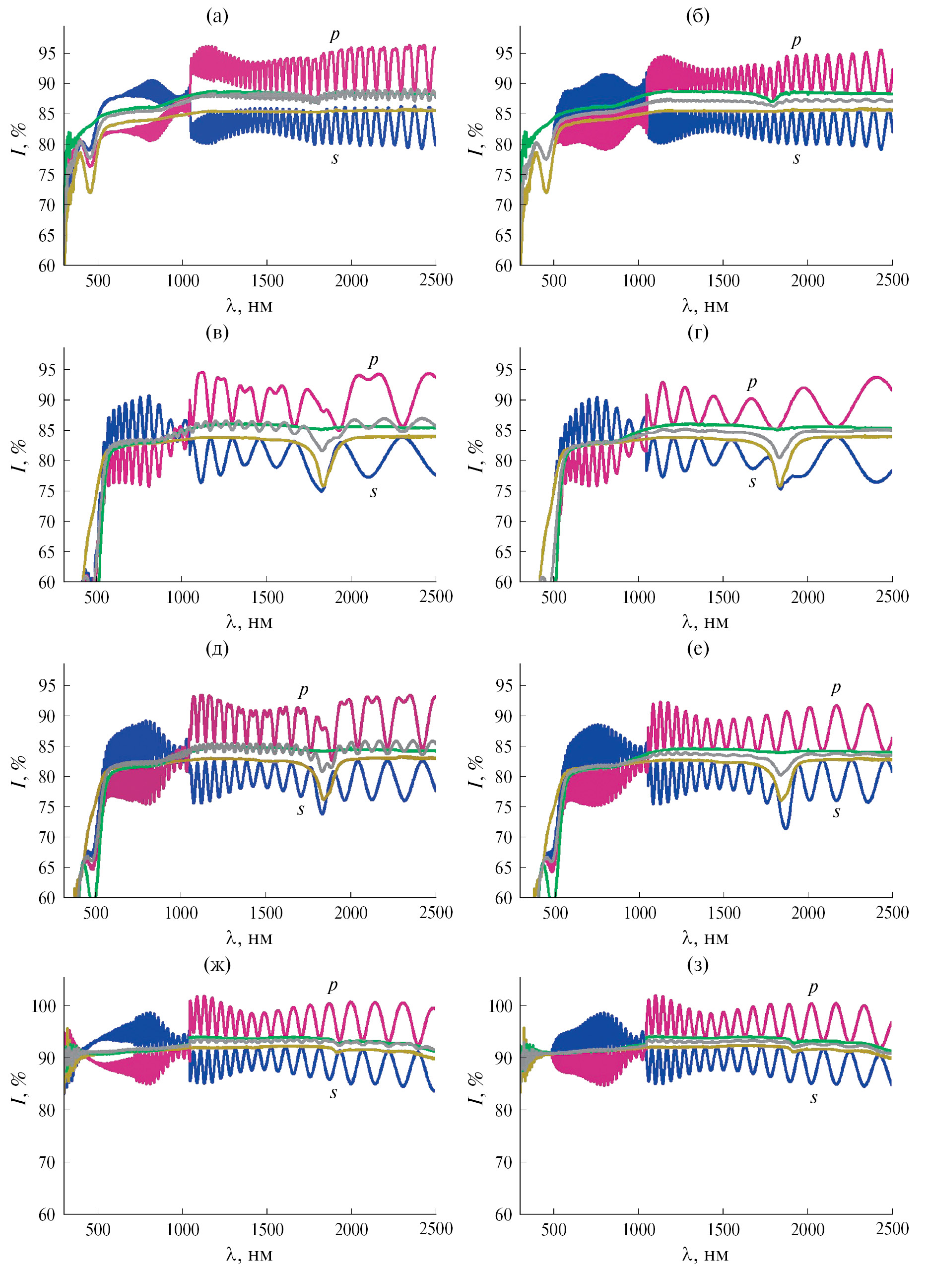 Рис. 2. Экспериментальные при φ = 0°, 45° (слева) и расчетные при φ = 45° с неидеальным ФЭУ (справа) спектры пропускания образцов х-среза Ca3TaGa3Si2O14, d = 1 мм (а, б), La3Ga5SiO14, d = 1 мм (в, г), La3Ga5.5Ta0.5O14, d = 1 мм (д, е) и кварца, d = 3.1 мм (ж, з), в диапазоне 300–2500 нм, p- и s-поляризация. Осциллирующие кривые в середине – средние величины (Ip(φ = 45°) + Is(φ = 45°))/2.
