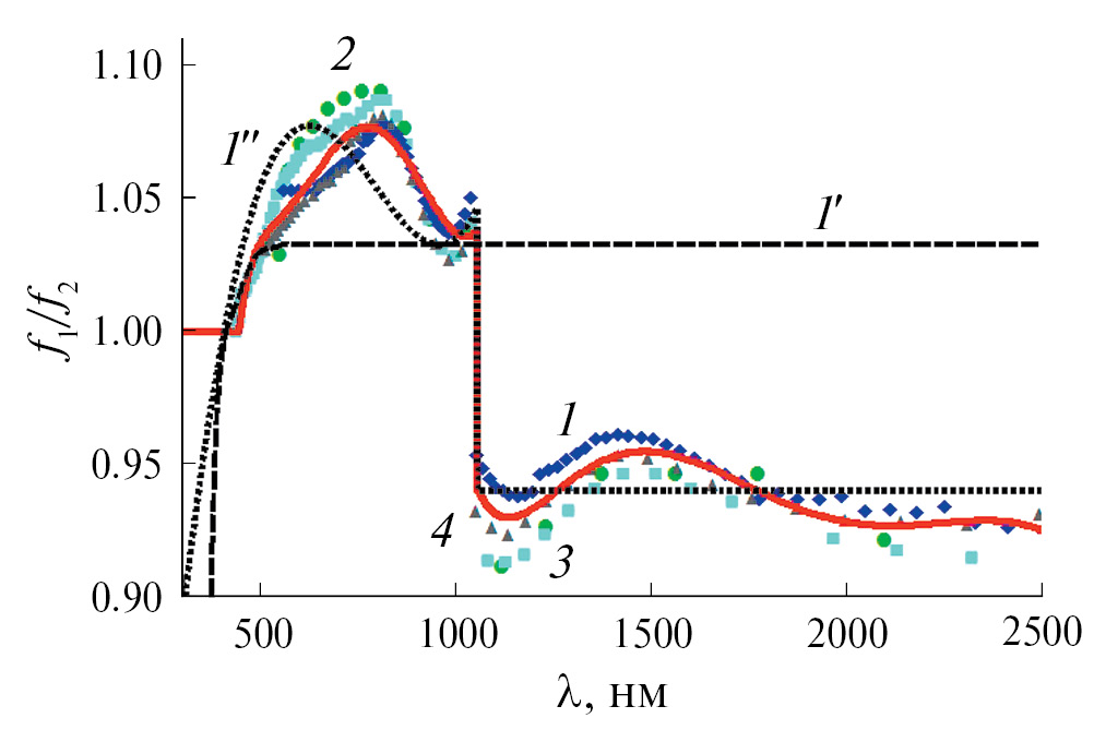 Таким образом, рассматривая экстремумы отношений (12), можно найти значения f1/f2 в отдельных точках. Величины f1/f2, рассчитанные с помощью (12), (13) по экспериментальным данным при разных длинах волн, показаны на рис. 3. Видно, что при λ = 1050 нм имеет место скачкообразное изменение f1/f2. По данным точкам с помощью аппроксимации полиномами рассчитаны дисперсионные зависимости f1/f2. При тех длинах волн, когда нельзя оценить f1/f2 из эксперимента из-за шума, принимаем f1/f2 = 1.