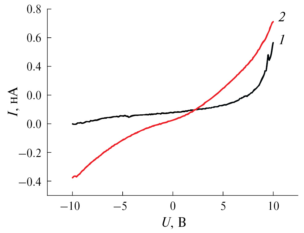 Температурные измерения локальных физических свойств кристаллов проводили на атомно-силовом микроскопе NTEGRA Prima (NT-MDT Spectrum Instruments, Зеленоград) в условиях чистой зоны контрольно-измерительного комплекса “TRACKPORE ROOM-05” (класс чистоты 5 ИСО (100), точность поддержания температуры (Т) воздушной среды в чистой зоне в диапазоне 298 ± 5 K составляла ±0.05 K, при относительной влажности воздуха 35–70% точность составляла ±1%). Кремниевый кантилевер (HA_FM, балка A, ООО “Капелла”, Зеленоград), покрытый Pt, имел следующие характеристики: резонансная частота f = 114 кГц, жесткость k = 6 Н/м, радиус закругления острия R < 35 нм. Локальные вольт-амперные характеристики (ВАХ) измеряли в диапазоне напряжений от −10 до +10 В. Рельеф поверхности образцов изучали в прерывисто-контактном режиме с использованием кантилеверов той же марки.