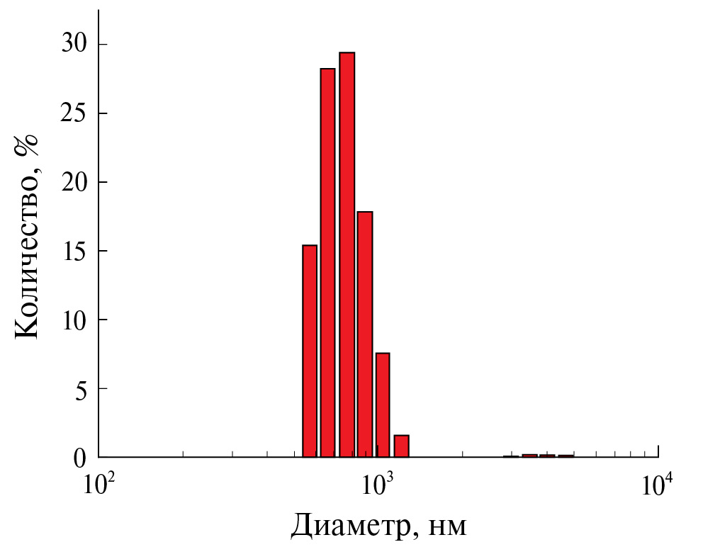 Рис. 2. Распределение синтезированных частиц по размерам по данным ДРС.