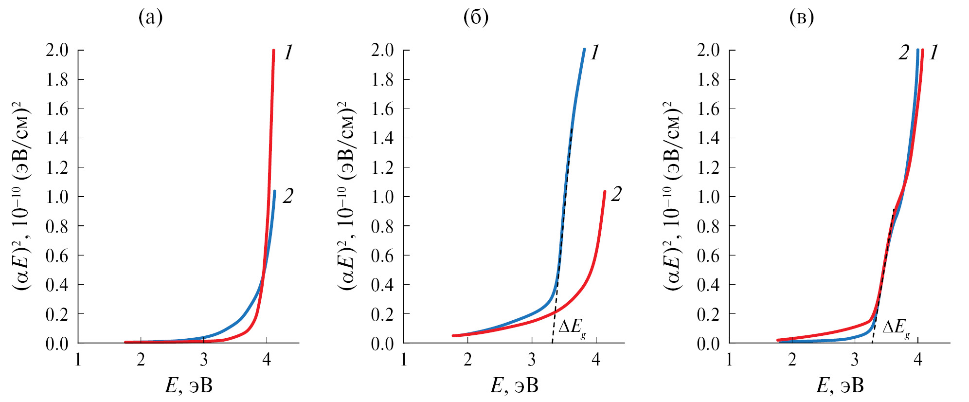 Рис. 2. Спектры поглощения образцов в координатах Тауца после термической (1) и комбинированной (2) обработки при температуре 120 (а), 130 (б) и 140°С (в).