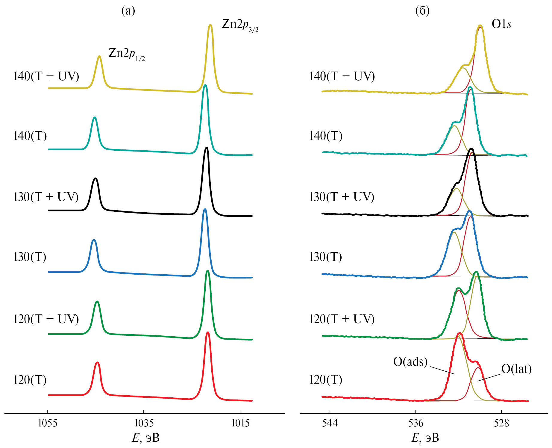 Анализ спектров рис. 4 показывает, что образцы 120(T) и 120(T+UV) содержат значительную долю атомов углерода, входящих в карбонильную группу (34 и 27% от общего углерода в пленках соответственно). Однако уже в образце 130(T) наблюдается значительное ее сокращение и накопление углерода на поверхности в форме С–С–С–. Вероятно, это связано с удалением ацетат-ионов из пленки и их трансформацией в аморфный углерод (сажу). В табл. 1 также представлен параметр . Для образцов 130(T+UV), 140(T) и 140(T+UV) его значение составляет всего 5%, что говорит о практически полном удалении ацетатных групп из пленки. Этот факт коррелирует с исчезновением на дифрактограммах тех же образцов рефлексов фазы LBZA и появлением межзонного оптического поглощения, характерного для прямозонного полупроводника. Таким образом, можно заключить, что пленки 130(T+UV), 140(T) и 140(T+UV) представляют собой систему аморфных оксида и гидроксида цинка с разным соотношением фаз.