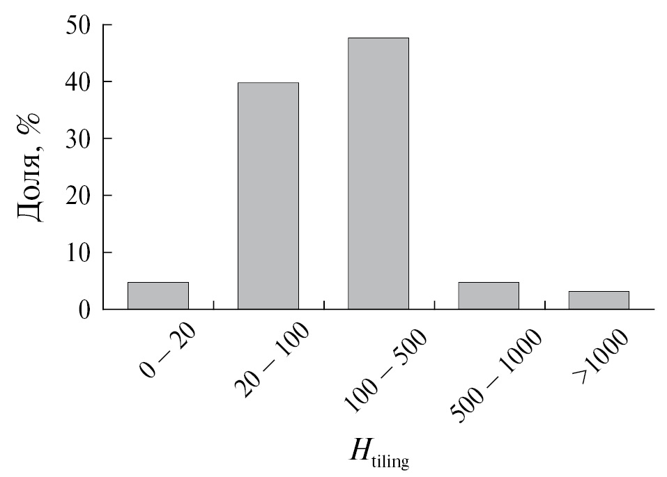 Самым сложным в исследованной выборке оказался тайлинг каркаса PAU (Htiling,tot = 2928.3 бит/сигнатура), обладающего и наибольшим значением IG,tot = 4763.5 бит/яч. В то же время еще более сложный каркас SFV (IG,tot = 19557.6 бит/яч.) [32] в исследованную выборку не попал. Самым простым оказался тайлинг каркаса ABW (Htiling,tot =9.5 бит/сигнатура), в то время как самый простой каркас – содалитовый (SOD, IG,tot = 16.5 бит/яч. [32]). Тайлинги, как и каркасы, можно классифицировать по классу сложности [36]: очень простые (0–20 бит/сигнатура), простые (20–100), средней сложности (100–500), сложные (500–1000) и очень сложные (более 1000). Больше 80% тайлингов простые или средней сложности (рис. 3).