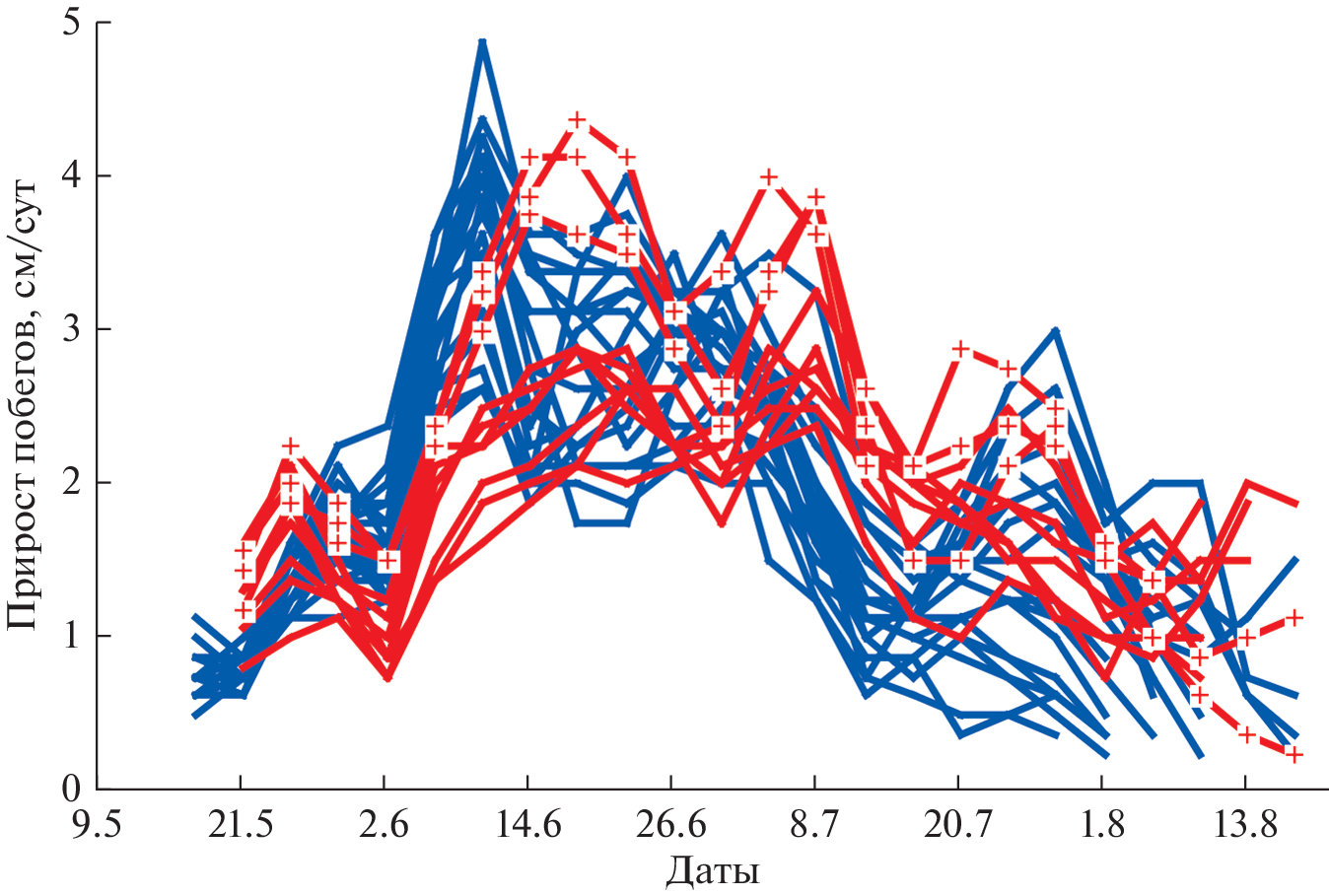 В статье проанализированы современные тенденции рационального использования быстрорастущих кустарниковых ив. Ива трехтычинковая (Salix triandra L.) рассматривается как источник прута для плетения, а также как вид, выполняющий важные экосистемные функции. Цель исследования – выявить влияние неравномерного распределения осадков на рост и развитие побегов ивы трехтычинковой. Тест-объект – генетически выровненная модельная инбредно-клоновая популяция ивы трехтычинковой. Материал – однолетние саженцы, выращенные из неукорененных черенков. Изучена динамика развития побегов в четырех клонах ивы трехтычинковой в два разных года с избыточным увлажнением. Второй год наблюдений отличался от предыдущего избытком осадков в период укоренения черенков. В условиях эксперимента максимальная длина годичных побегов составила 210–220 см, независимо от года наблюдений. Установлена цикличность изменения суточного прироста побегов. Полный сезонный цикл развития годичных побегов включает четыре многодневных цикла. Второй и третий многодневные циклы характеризуются наибольшим суточным приростом побегов в первой половине лета. Максимальный суточный прирост побегов в оба года наблюдений составил 4.1–4.9 см/сут в начале лета. Весенний и позднелетний суточный прирост на большинстве побегов не превысил 2.3–2.7 см/сут. На второй год наблюдений позднелетний суточный прирост (в среднем 1.9 см/сут) был немного выше, чем в первый год (в среднем 1.6 см/сут). Выявлена синхронизация развития побегов в начале лета, независимо от года наблюдений и от фактора клона. Избыточное увлажнение в период укоренения черенков приводит к смещению пиковых значений суточных приростов на более поздние сроки. На фоне неравномерного распределения осадков выявлено влияние фактора клона на сезонную динамику суточного прироста. При изучении роста и развития побегов в клонах ивы трехтычинковой необходимо учитывать неравномерность распределения осадков в первой половине вегетационного периода.