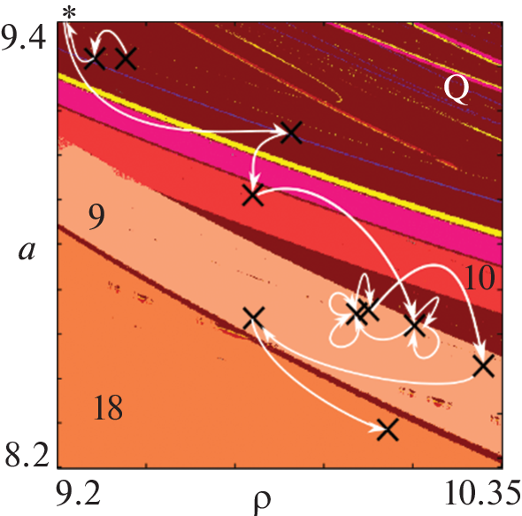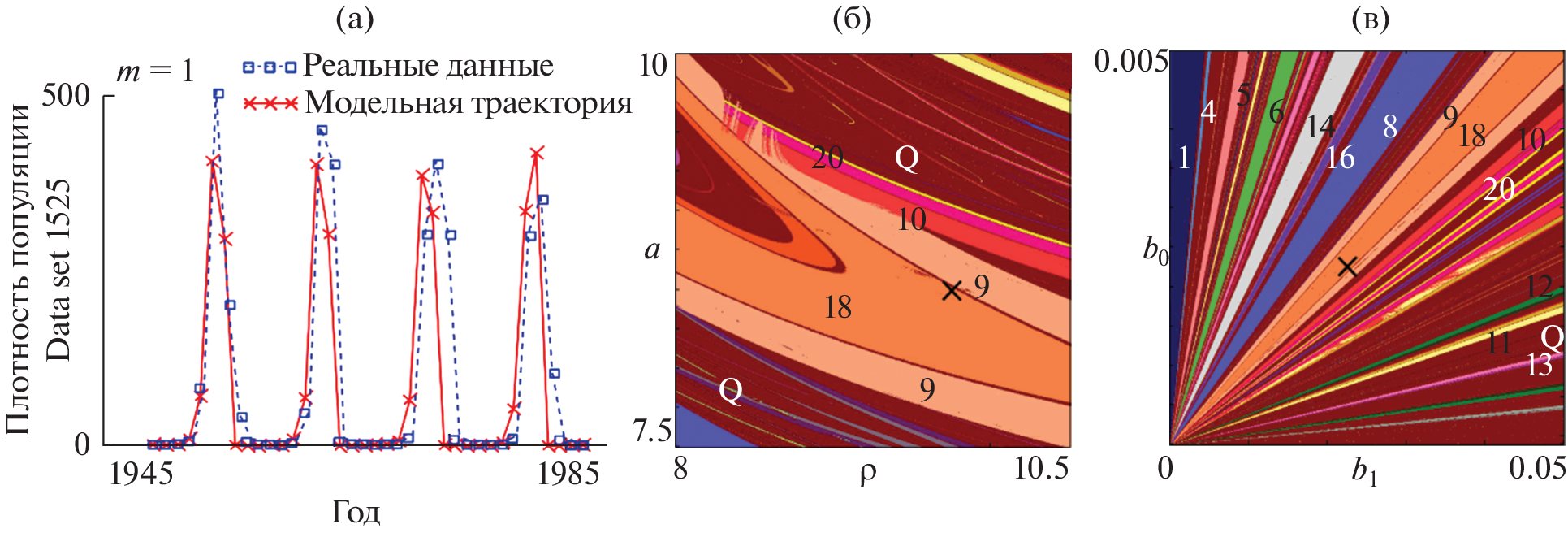 Модель Морана–Рикера с запаздыванием 1 и 2 года, учитывающая внутрипопуляционные саморегуляторные механизмы, применяется к описанию динамики плотности двух популяций листовертки лиственничной (Zeiraphera griseana). Используются данные о популяциях, обитающих в Швейцарии в локациях Graubunden (the Global Population Dynamics Database: Data set 1525 (Baltensweiler, Fischlin, 1988)) и Oberengadin (Baltensweiler, 1991). Оценки значений параметров моделей находились путем минимизации суммы квадратов отклонений эмпирических и модельных траекторий. Показано, что найденные точечные оценки популяционных параметров удовлетворяют статистическим критериям и располагаются в области квазипериодических колебаний, как правило, соседствуя с другими динамическими режимами. Следовательно, вариация демографических параметров, например, в результате эволюционных процессов или же влияния модифицирующих факторов может привести к смене динамического режима. Чтобы проверить прогностические свойства этих моделей, часть данных была использована для оценок значений параметров, а оставшаяся часть – для сопоставления реальной динамики и модельного прогноза. Как оказалось, качество прогноза существенно зависит от характера динамики в конце обучающей выборки, используемой для оценки параметров. Наилучший прогноз будет получен, если обучающая выборка заканчивается на фазе пика численности. В случае фазы низкой численности прогноз может характеризоваться приемлемой ошибкой, однако характер прогнозируемой динамики может измениться: например, произойдет смещение пика численности. Для Data set 1525 проведено сопоставление точечных оценок, полученных по обучающей выборке разной длины, с динамическими режимами модели Морана–Рикера. Это позволило получить представление об эволюции динамических режимов в популяции листовертки лиственничной и выявить переходы от одних динамических режимов к другим.