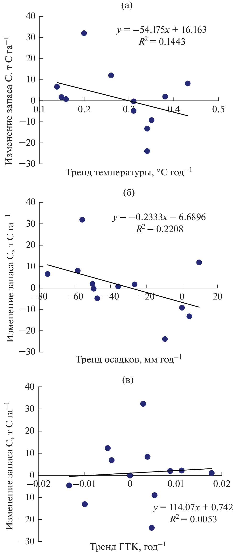 Modern global climate change manifests in an ever intensifying fashion, affecting anthropogenic and natural systems. Bioclimatic models predict significant shifts in biome boundaries, including a reduction in the forests’ proportion in the forest-steppe areas. This process can also affect carbon stocks. The aim of the work was to assess the impact of climate and its changes on the values and their changes of the phytomass’ carbon stocks of forest stands according to the data of repeated surveys of permanent sample plots. In the southern regions of the European Russia, 8 forests were selected and trial plots were set up. Repeated surveys were carried out on the test plots in 2010–2011, 2014–2015, 2019–2020. The carbon reserves of the living and the dead components of forest stands were calculated according to taxation characteristics. The litter carbon stocks were determined by the gravimetric method. The meteorological information analysis was carried out using data from the meteorological stations closest to the objects of study. Average annual temperature for 1991–2020 increased compared to 1961–1990. by 1.13°C, which is 2.5 times more than the global average. At the same time, annual precipitation decreased from 448.2 mm to 445.4 mm. The average value of the G.T. Selyaninov’s hydrothermal coefficient for May-September during the 1961–1990 period was 0.85, and 0.79 during the 1991–2020 period. The stock of the phytomass carbon in the studied forest stands varied from 38.5 ± 7.4 t C ha–1 to 270.6 ± 52.8 t C ha–1. Repeated surveys revealed both increases and decreases in phytomass carbon stocks, which ranged from –23.8 to 31.9 t C ha–1 over a five-year interval. The phytomass carbon stocks and climatic characteristics analysis revealed a statistically significant correlation with the HTC for May-September. However, comparison of changes in phytomass with changes in the average annual temperature, annual precipitation and HTC for May-September did not reveal significant dependencies. The absence of significant correlations between changes in phytomass carbon and climatic parameters’ changes can be determined by the forest ecosystems’ stability, which ensures the preservation of their functions over several years intervals.