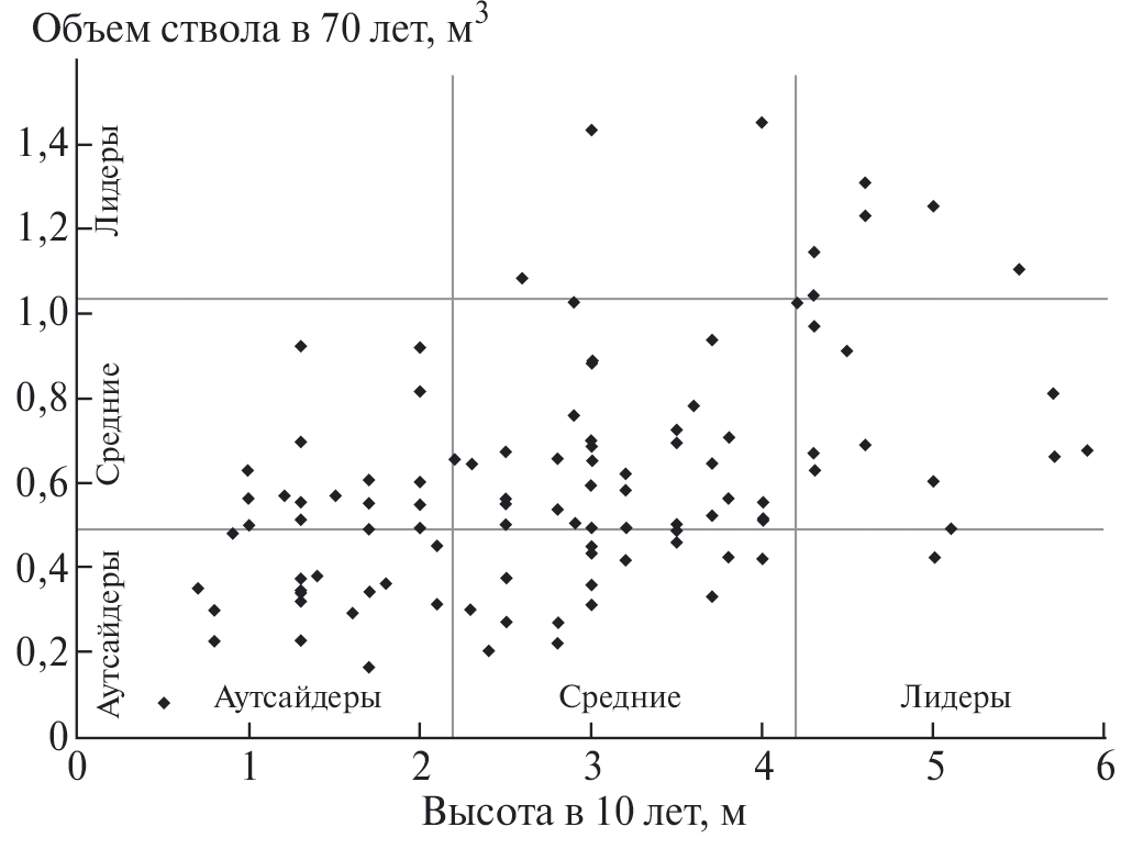 Для практики лесного хозяйства важно выделять деревья-лидеры и близкие к ним по признаку высоты средние деревья. Положительными являются своевременные рубки ухода по классическому низовому методу, т. е. приемы с вырубкой наиболее отстающих в росте деревьев. Из практики рубок ухода должны быть исключены верховой и комбинированный методы уходов, при которых вырубаются деревья-лидеры и лучшие экземпляры из числа средних деревьев, что уже давно подтверждено отрицательными результатами таких приемов на ряде экспериментальных объектов (Георгиевский, 1948; Мерзленко и др., 2008). Что касается средних деревьев, то они более стабильны по своему ранговому положению.