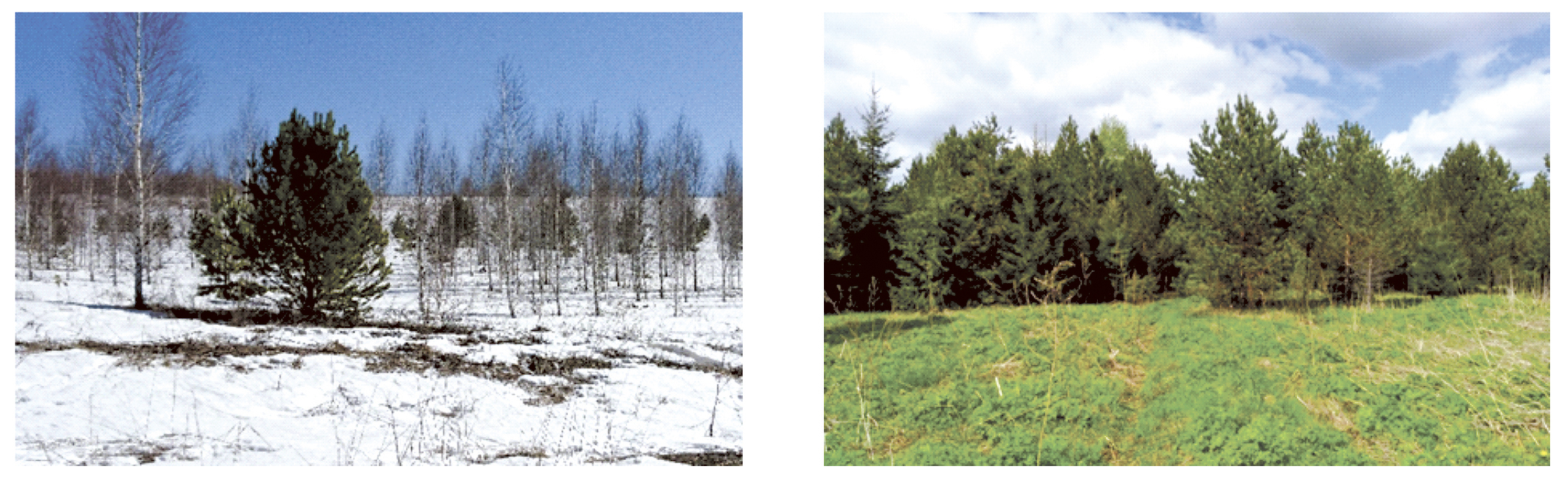 Рис. 2. Типичные участки бывшей пашни, зарастающие молодым лесом на опорных участках Пермского края.