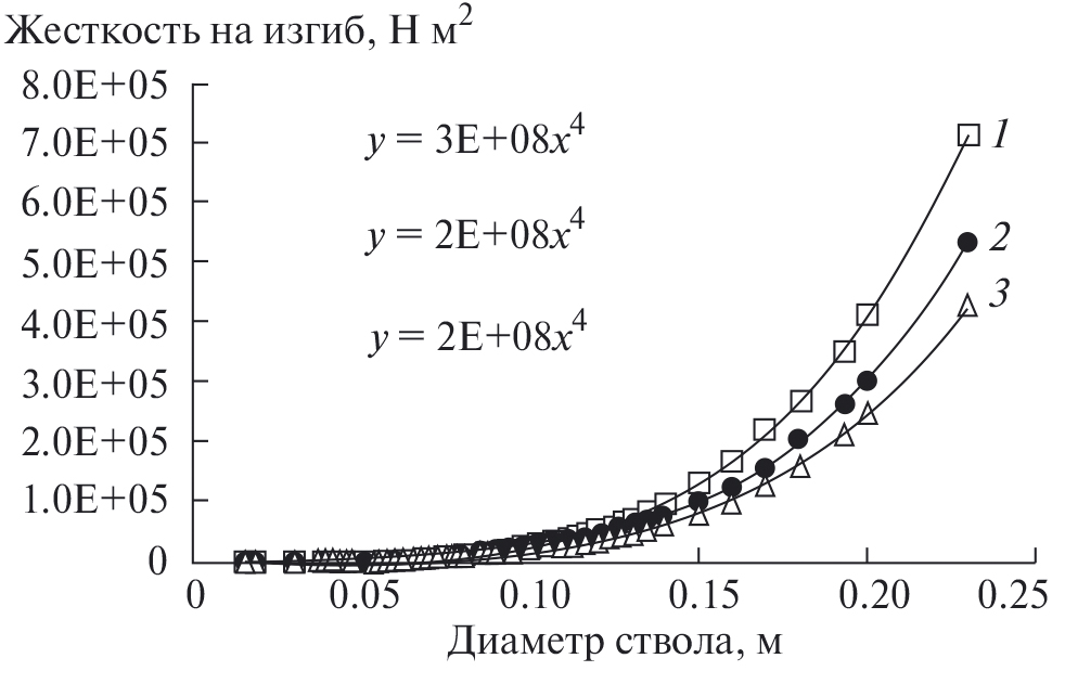 Рис. 5. Зависимость жесткости на изгиб от диаметра ствола в условиях действия экологического фактора (температура окружающей среды). Примечание. Моделирование производилось в зимний сезон при температуре –18C (1), при ускоренном оттаивании T = +12C (3) и в летний сезон при T = +15C (2).