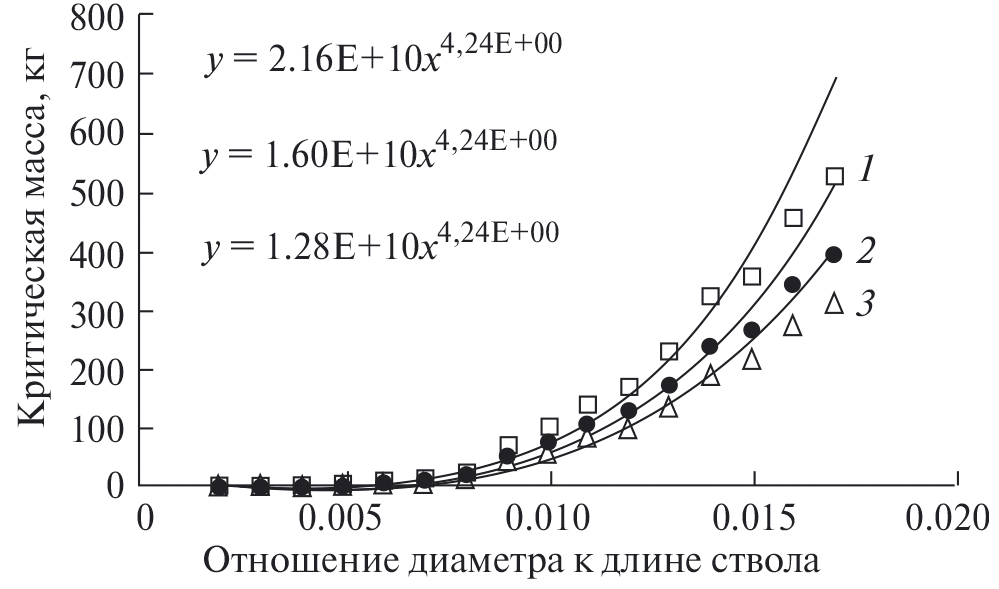 Рис. 6. Зависимость критической массы (mcr) от отношения диаметра ствола (d) к его длине (l) в условиях действия экологического фактора (температура окружающей среды). Примечание. Моделирование производилось в зимний сезон при температуре –18C (1), при ускоренном оттаивании T = +12C (3) и в летний сезон при T = +15C (2).