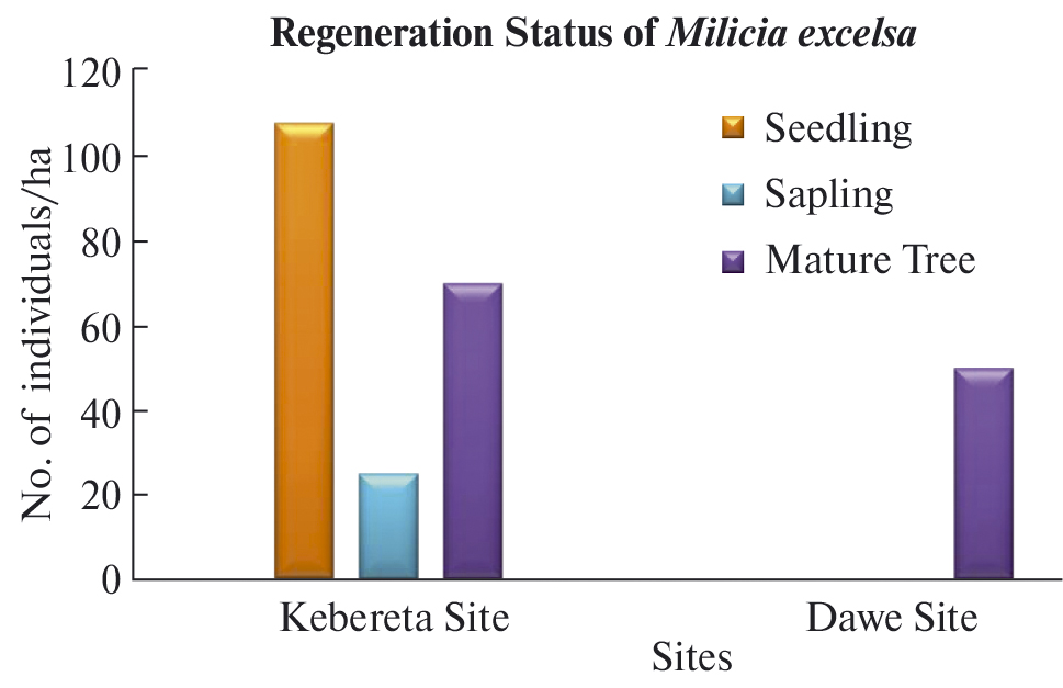 In the Kebereta site natural forest, the number of individuals is as follows: seedlings > saplings < tree/shrub state. This pattern shows ‘fair’-type regeneration, namely, poor reproduction and hampered regeneration (Dhaulkhandi et al., 2008). The target species individuals (M. excelsa) in the Dawe site natural forest were absent in the seedling and sapling stages, but relatively many individuals were presented in the mature tree stage. It corresponds to the result of the study where it was concluded that it is ‘none’-type regeneration.