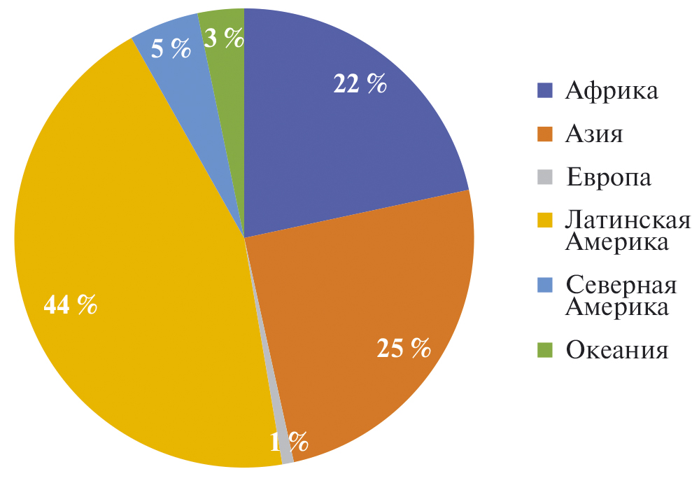 Самыми активными регионами по зарегистрированным лесным проектам стали регионы Латинской Америки, Азии и Африки (рис. 1), а наиболее часто применяемыми механизмами оказались механизмы ARR и REDD (рис. 2). Детальное распределение зарегистрированных лесных проектов рассмотрено в Приложении.