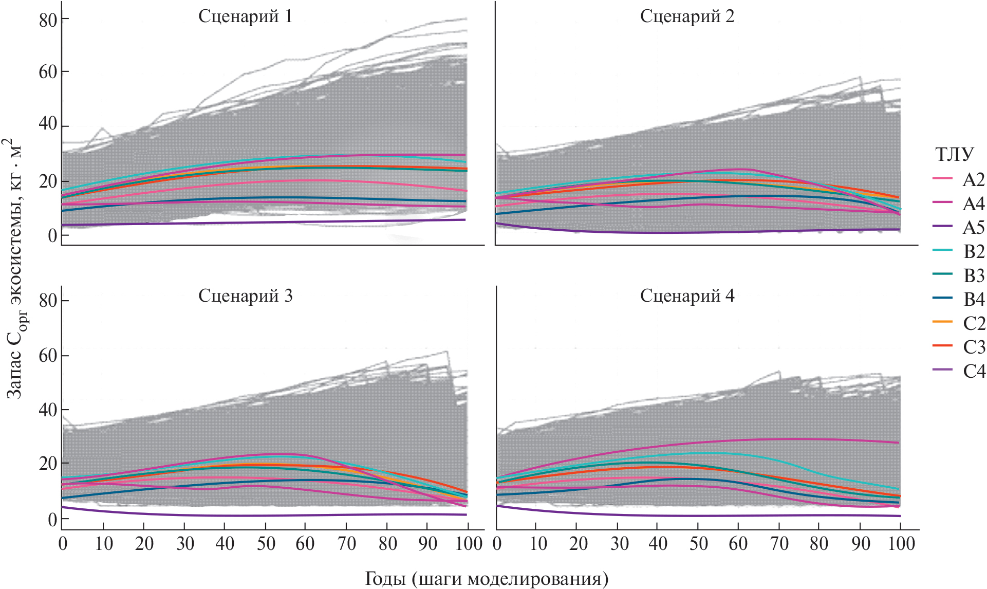Рис. 4. Динамика экосистемных запасов С на территории Данковского лесничества (серые линии соответствуют отдельным таксационным выделам; цветные линии — медианные значения для разных ТЛУ; описание сценариев дано в табл. 3).