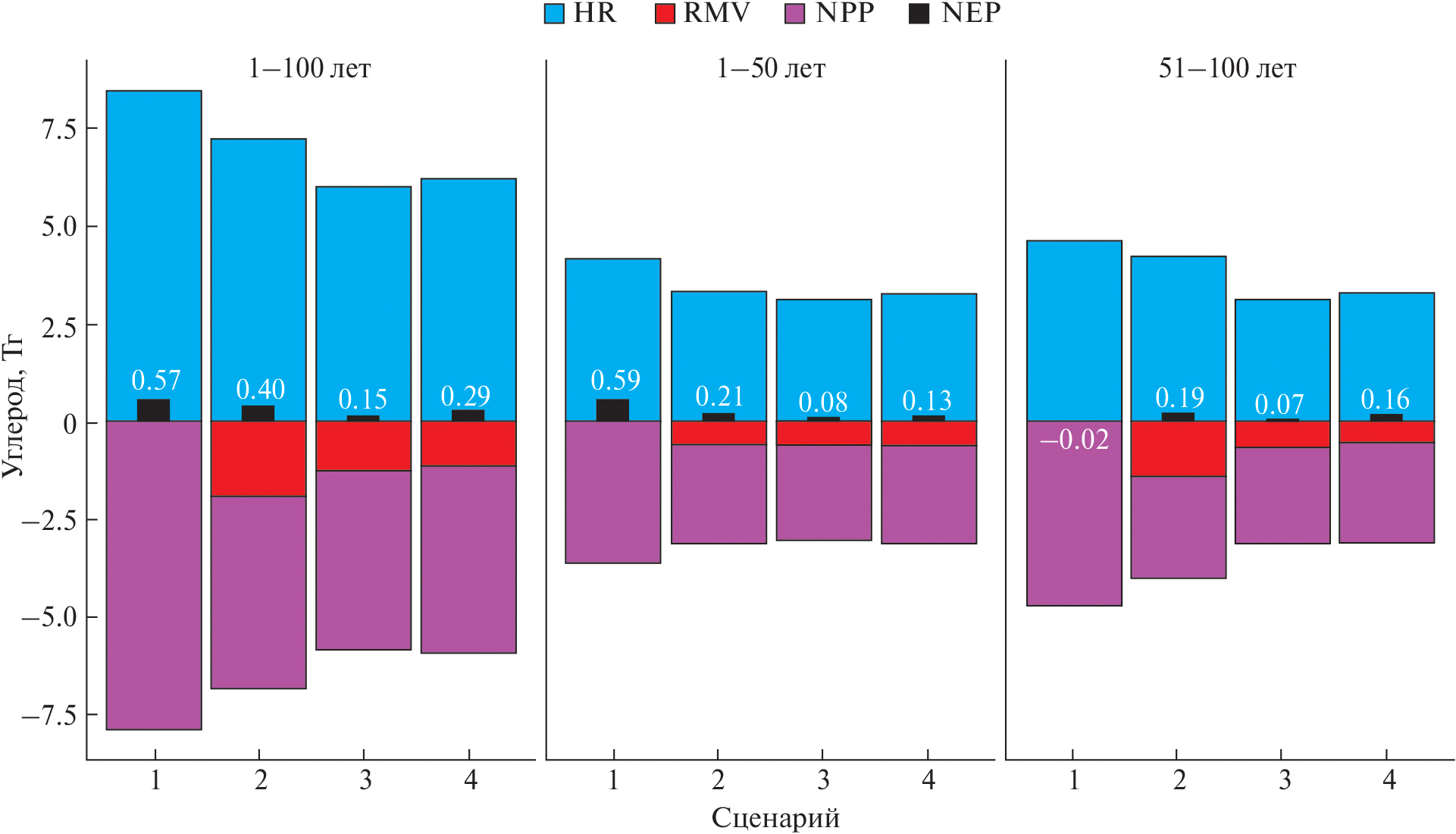 Рис. 5. Основные элементы и результирующие баланса углерода для всей территории Данковского лесничества на разных временных отрезках и при разных сценариях лесопользования (HR – гетеротрофное дыхание почв, RMV — вынос Сорг с фитомассой древостоя при рубках, NPP — чистая первичная продукция древостоя, NEP — нетто-поглощение С в экосистемах как результирующая трех указанных выше потоков с учетом их знака.