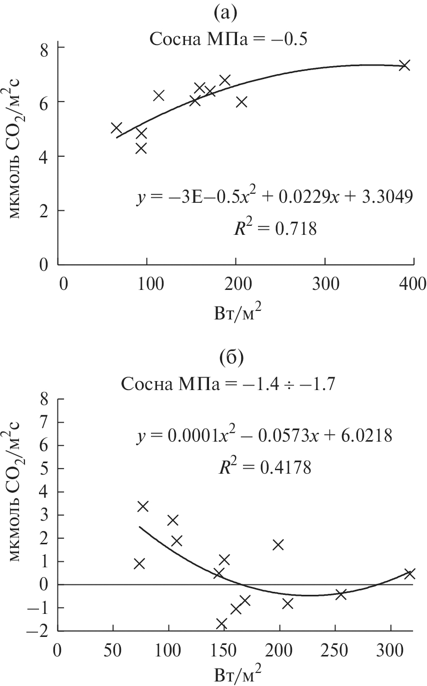 Рис. 5. Зависимость среднедневной интенсивности фотосинтеза сосны от среднедневной интенсивности солнечной радиации: (а) — при оптимальном водообеспечении (–0.5 МПа), (б) — при недостаточном водообеспечении (–1.4 ÷ –1.7 МПа).