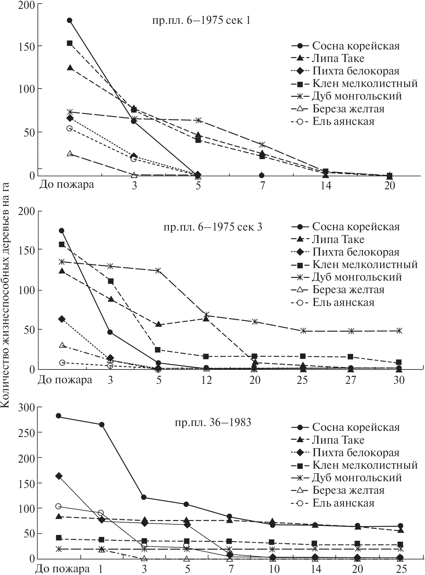 Наблюдения за лесовосстановительным процессом на пр. пл. 36–1983 проводились в течение 25 лет. Длительные стационарные исследования лесовосстановительного процесса после пожаров были проведены еще на пяти участках, подвергшихся пожарам различной интенсивности в период летних засух 1971 и 1973 гг. на территории Верхнеуссурийского биогеоценотического стационара.