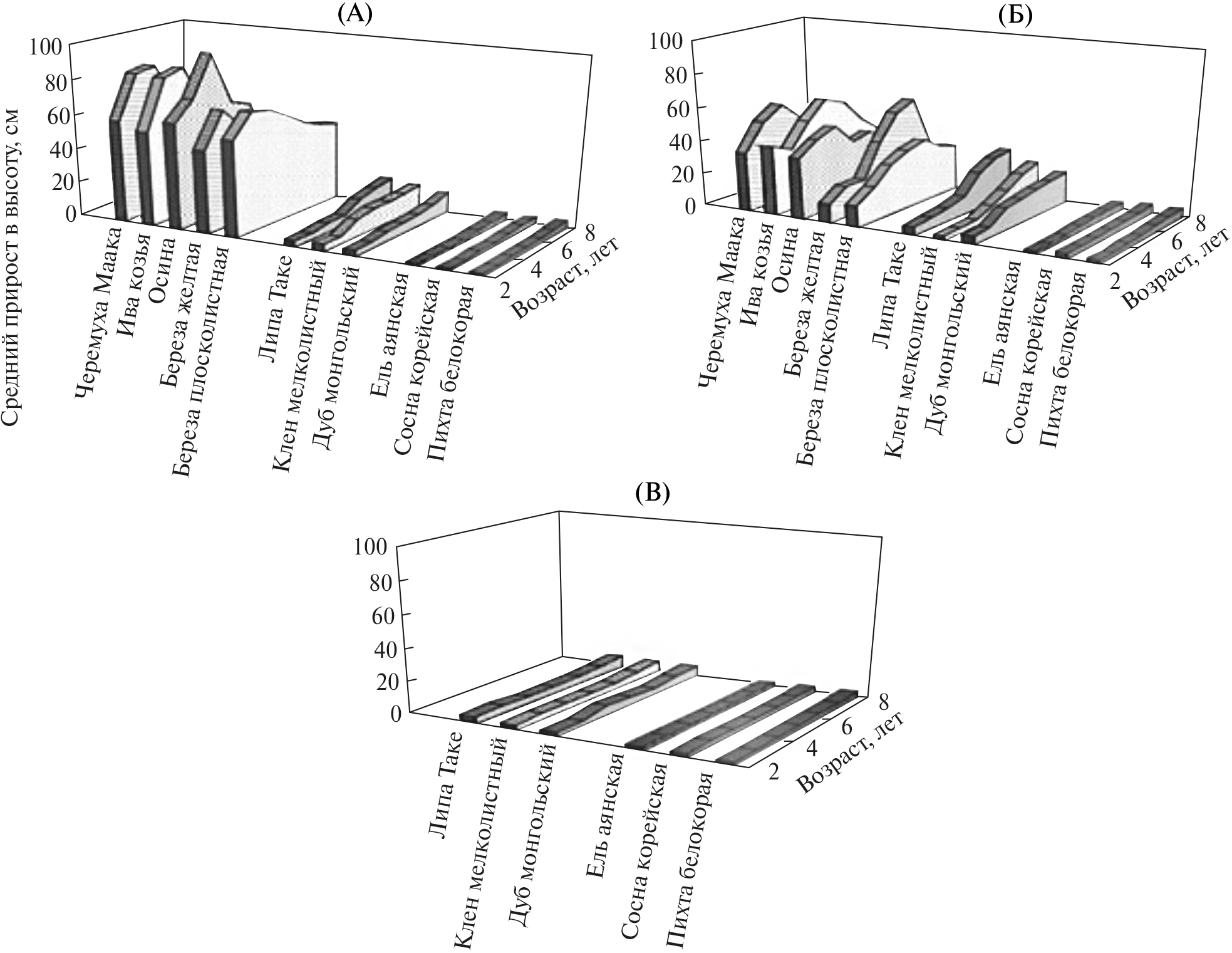 Рис. 2. Скорость роста молодых древесных растений в первые 8 лет их развития на участке гари с сильно поврежденным древостоем (пр. пл. 6–1975, секция 1; А), на участке гари с частично сохранившимся древостоем (пр. пл. 6–1975, секция 3; Б), на ненарушенном эталонном участке дубово-кедрового лимонниково-лещинного леса (пр. пл. 6–1975, секция 4; В).