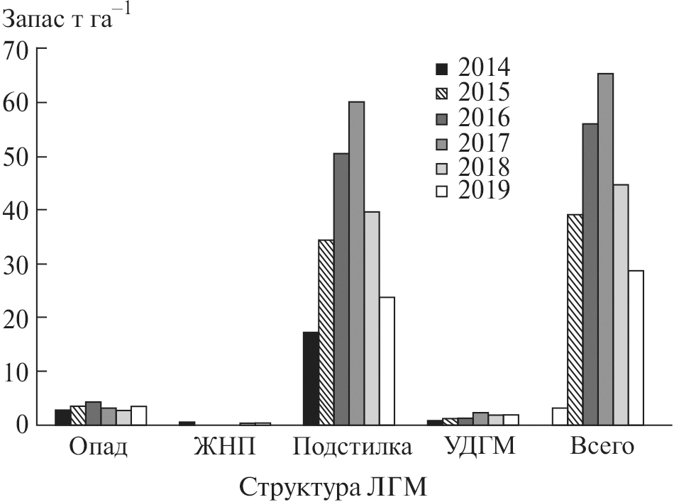 В течение 5 лет на ПП 2 проведено 2 контролируемых выжигания (2014 и 2017 гг.) с периодичностью в 3 года. Допожарный общий запас ЛГМ был равен 32.3 т га–1 (рис. 2). На лесную подстилку приходилось 27.4 ± 5.86 т га–1 (85% от общего запаса). Запас опада насчитывал 2.9 ± 0.72 т га–1, где основной вклад принадлежал хвое (38%) и шишкам (45%). Травяная ветошь и древесная кора составляли 3 и 14% соответственно. Запас ЖНП был равен 3.9% (1.3 ± 0.34 т га–1). На запас УДГМ приходилось 0.7 ± 0.09 т га–1 с наибольшей долей 1-го (56%) и 2-го классов диаметров (25%). УДГМ 3-го класса составили 19%. На запас проводников горения приходилось 31.5 т га-1.