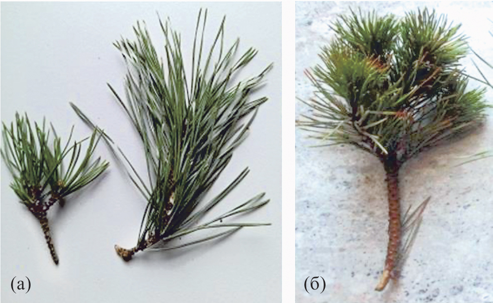 Рис. 1. А — образец хвои сосны обыкновенной: слева — больного дерева с оголенным основанием, укороченной хвоей и образованием бокового ветвления на верхушке, справа ‒ внешне здорового растения. Образцы предоставлены А.Г. Молчановым. Фото Т.Б. Кастальевой, 2022 г. Б – образец хвои больного дерева сосны горной с укороченной хвоей, покраснением концов игл и повышенным ветвлением. Фото Д.З. Богоутдинова, 2018 г.
