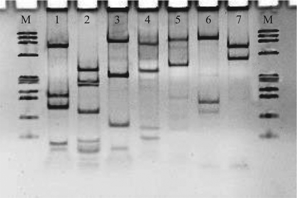 Рис. 2. Электрофоретические профили фрагментов ампликона ДНК 16Sr гена фитоплазмы, выделенной из хвои сосны горной, полученные после обработки эндонукеазами рестрикции: 1 ‒ AluI, 2 ‒ MseI, 3 ‒ HhaI, 4 ‒ TaqI, 5 ‒ HpaII, 6 – HaeIII, 7 ‒ RsaI в 5%-ном ПААГ. М – маркер молекулярного веса ØХ174 DNA/BsuRI (HaeIII) (Fermentas, Lithuania), размер фрагментов сверху вниз (bp): 1353, 1078, 872, 603, 310, 281, 271, 234, 194, 118, 72. Фото Н.В. Гирсовой, 2019 г.