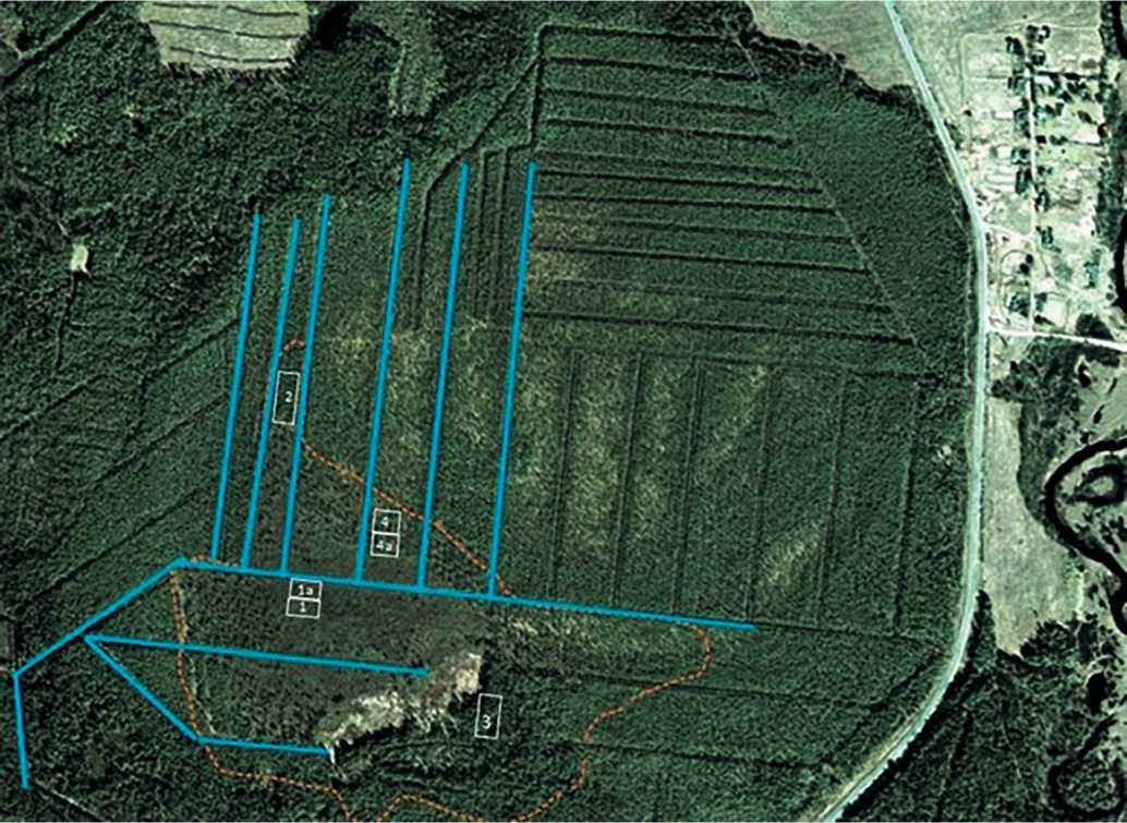 Рис. 1. Схема расположения ПУ на территории, пройденной пожаром 1999 г. Условные обозначения: сплошные линии — осушительные каналы; пунктирная линия — граница пожара. ПУ 1а, 2а, 2b, 4а — приканальные полосы; ПУ 1, 2, 4 — середина между каналами; ПУ 3 — окрайка болота.