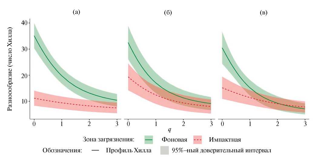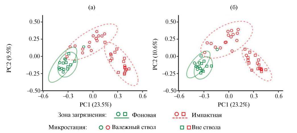 Разнообразие таксоценов характеризовали профилями Хилла (Chao et al., 2014), рассчитанными в пакете vegan v. 2.6. Ординацию микростаций проводили на основе расстояния Брея—Кёртиса по абсолютному обилию методом главных координат (PCoA) в пакете ape v. 5.7 (Paradis, Schliep, 2019). Использовали два варианта ординации — на уровне надвидовых таксонов и по видовому составу тех групп, где он был определен. Из-за наличия большого числа нулевых проб в импактной зоне ординация по видовому составу для отдельных таксоценов, особенно маловидовых, затруднительна. Поэтому во втором варианте использовали обобщенный массив видов по дождевым червям, моллюскам, паукообразным, литобиидам и геофилидам, жужелицам, щелкунам. В него также включили одновидовые таксоны (диплоподы, ряд семейств жесткокрылых (табл. 1)). Статистическую значимость различий группового и видового состава между зонами загрязнения и микростациями оценивали с помощью PERMANOVA (999 перестановок) в пакете vegan v. 2.6.