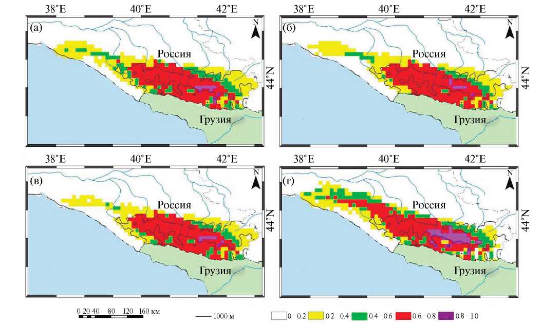 Примечание. Цветовые градации показывают уровень вероятности обнаружения вида от 0 до 1 (0—100 %).