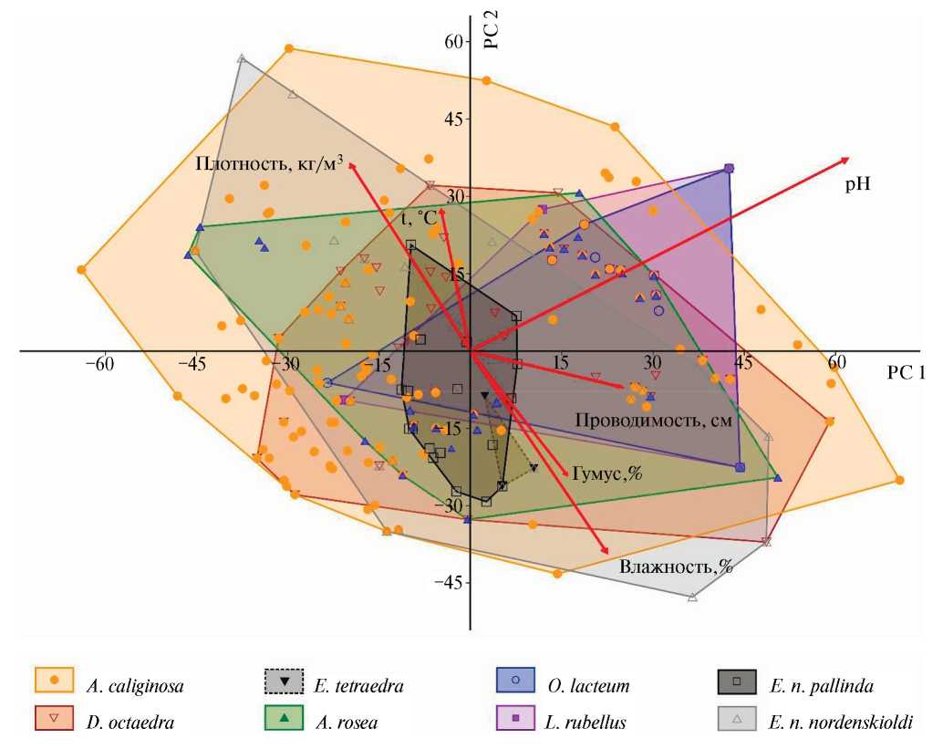 Визуализация диапазонов толерантности видов к почвенным факторам методом главных компонент (PCA) представлена на рис. 3. Главная компонента 1 описывает 41.63 % данных. С ней максимально коррелирует рН (0.92), электропроводность почв (0.59), влажность почв (0.42). Главная компонента 2 охватывает 25.02 % данных. С ней в наибольшей степени коррелирует плотность почв (0.67), влажность (–0.62) и температура почв (0.59), гумус (–0.40). Из рис. 3 видно, что диапазоны толерантности аборигенного вида — E. n. nordenskioldi и E. n. pallida и европейских видов-вселенцев пересекаются, но есть отличия по ширине диапазона.