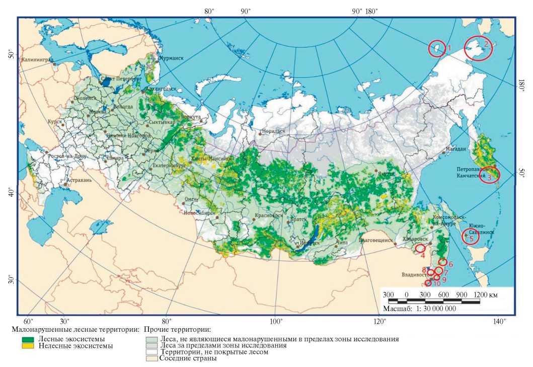 Рис. 1. Карта малонарушенных лесов России (по www.transparentworld). Безлесные зоны: 1 — о. Врангеля, 2 — Чукотский АО. Лесные зоны: 3 — каменно-березовые леса Западно-Камчатской провинции; 4 — кедрово-широколиственные леса Маньчжурской материковой провинции (центральный кластер заповедника «Бастак»); 5 — пихтово-еловые леса с примесью лиственных пород (юго-восточная часть Сахалина, бас. р. Найбы); 6 — северные кедрово-широколиственные леса Амурско-Уссурийской провинции (восточная часть Сихотэ-Алинского заповедника); 7 — типичные кедрово-широколиственные леса Приморско-Уссурийской лесорастительной провинции кедрово-широколиственные, дубовые и широколиственные (липовые) леса (Верхне-Уссурийский стационар); 8 — южные кедрово-широколиственные леса Южно-Приморской лесорастительной провинции (Уссурийский заповедник); 9 — черно-пихтовые-широколиственные леса; 10 ‒ реликтовые лиановые чернопихтово-широколиственные леса (заповедник «Кедровая падь»).