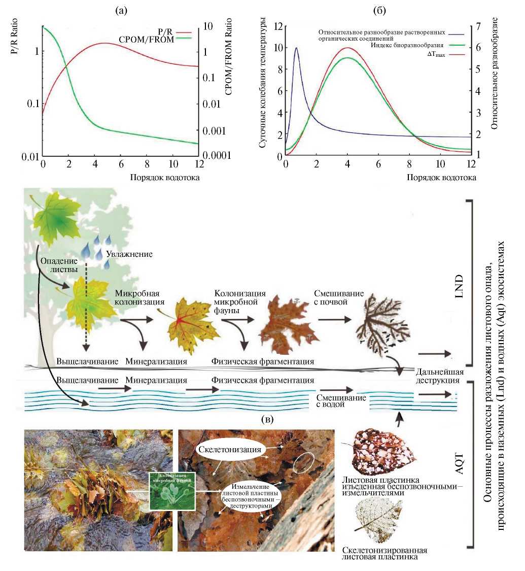 Органическое вещество в водотоках, как уже сказано выше, имеет разные источники происхождения. Различают органическое вещество аллохтонного (вне водоема) и автохтонного (внутри водоема) происхождения. Аллохтонное органическое вещество поступает в водоток как напрямую с прибрежных территорий, так и в результате занесения ветровыми потоками. Это может быть вещество растительного (листовой опад, ветки, фрукты) и животного (экскременты животных или их мертвые тела) происхождения. Различают крупнодисперсное органическое вещество (CPOM = coarse particulate organic matter), мелкодисперсное (FPOM = fine particulate organic matter) и растворенное органическое вещество (DOM = dissolved organic matter). CPOM подвергается определенному процессу деградации внутри водной системы. Например, разложение листовых пластин (широколиственный опад) происходит как в результате химических процессов, участвующих в разложении (выщелачивание), так и благодаря работе грибов, бактерий, а также беспозвоночных фито- и детритофагов (Petersen, Cummins, 1974; Findlay, Arsuffi, 1989; Gessner, Chauvet, 1994; Crowl et al., 2001; Li, Dudgeon, 2008; Nelson, 2011; Lin, Webster, 2013; Griffiths, Tiegs, 2016) (рис. 3в).