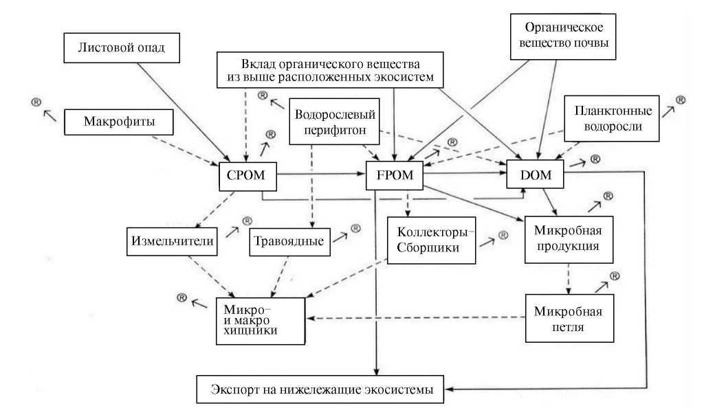 Верхние участки водотоков (ручьи 1—3 порядка) часто сильно затенены и получают большое количество органического вещества от прибрежной растительности, являясь гетеротрофными зонами, где соотношение валового фотосинтеза (P) к дыханию (R) меньше единицы (рис. 3а). Здесь преобладают каменисто-галечные грубые субстраты, поскольку градиенты потока и эрозионные процессы высоки, на них формируются сообщества с преобладанием измельчителей, являющихся первыми механическими деструкторами листового опада. Листовой опад и продукты его первичной деструкции измельчителями относят к категории грубодисперсного органического вещества — CPOM (coarse particulate organic matter). При дальнейшем разложении СРОМ в процессе выщелачивания, микробной колонизации и минерализации, физической фрагментации происходит его дальнейшее измельчение и превращение в тонкодисперсное органическое вещество — FPOM (fine particulate organic matter), которое экспортируется водным потоком на нижние этажи водотока и улавливается из потока фильтраторами, а при отложении на дно — коллекторами-сборщиками. Далее FPOM трансформируется в растворенное органическое вещество DOM (dissolved organic matter), которое, в конце концов, способно коагулироваться в желатинообразные пеллеты — пищевой ресурс коллекторов-сборщиков (рис. 4).