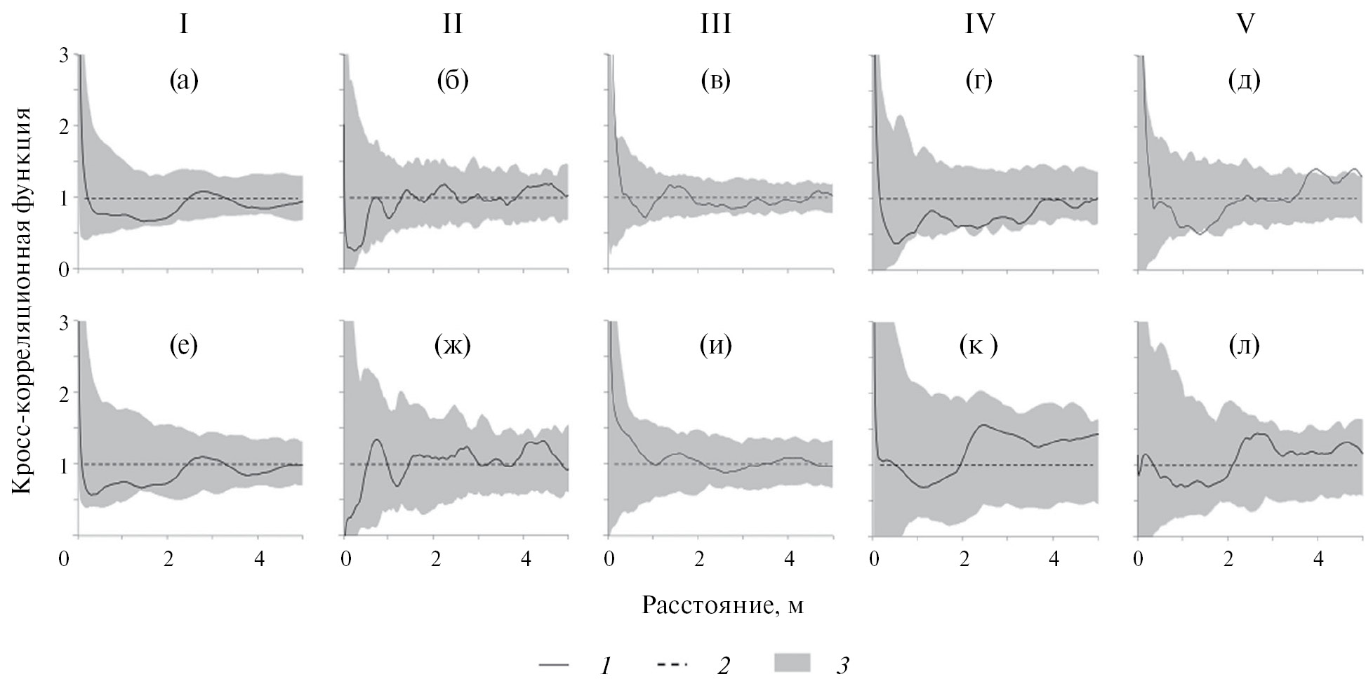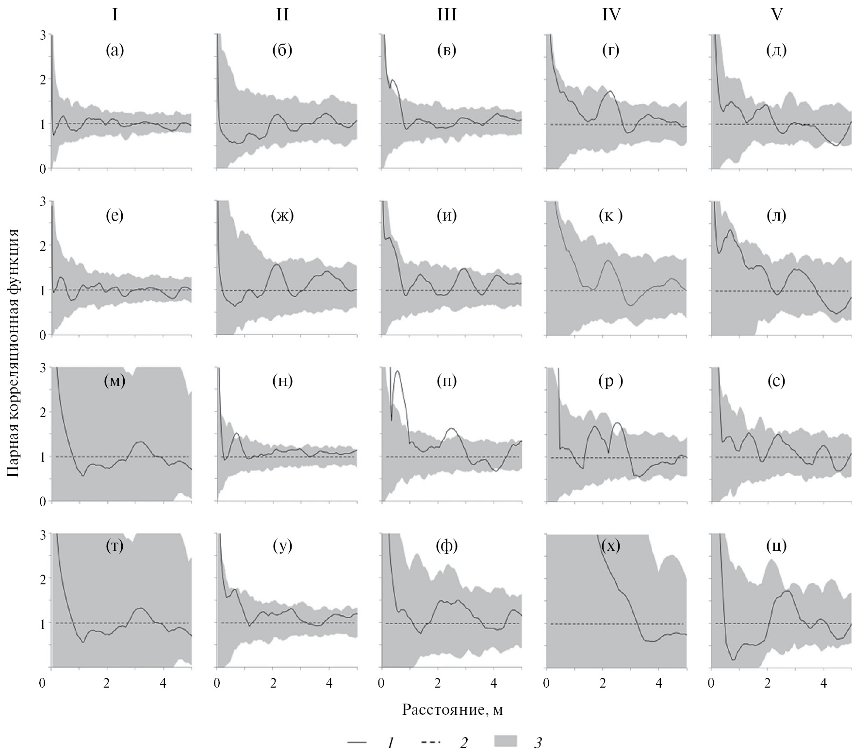 Рис. 3. Проверка нулевой гипотезы о случайности точечного процесса. 1 – эмпирическая парная корреляционная функция ĝ (r); 2 – поведение функции g (r) в случае ППС; 3 – область принятия гипотезы о ППС, полученная с помощью 999 генераций однородного процесса Пуассона для: а–д – всех пород деревьев; е–л – деревьев ели; м–с – всех пород подроста; т–ц – подроста ели. Здесь и на следующем рисунке обозначение колонок: I – ельник травяно-зеленомошный (ППП 6); II – ельник сфагновый (ППП 7); III – ельник морошково-сфагновый (ППП 8); IV – ельник зеленомошный (ППП 10); V – ельник кустарничково-зеленомошный (ППП 12).