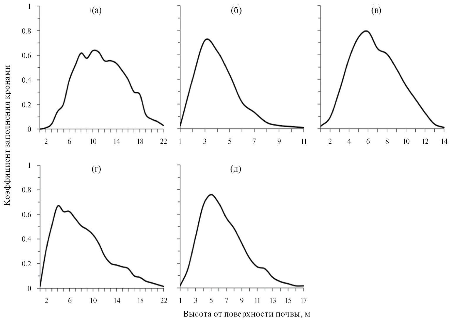 Согласно распределению коэффициентов заполнения крон в притундровых еловых лесах Печорского бассейна, было установлено два типа вертикальной структуры древостоев. Наиболее продуктивный древостой ельника травяно-зеленомошного (ППП 6) характеризуется растянутым пологом в вертикальном направлении, когда деревья разнятся по высоте, но схожи по протяженности кроны (рис. 5, а). Такие древостои называют «неярусными» и относят к «диффузной» структуре по классификации В.В. Плотникова (1979). Преобладающим типом вертикальной структуры изученных древостоев является «регулярная понизу» (рис. 5, б–д). При такой структуре деревья, формирующие полог, значительно различаются по высоте, но основания их крон располагаются преимущественно на одном уровне от поверхности почвы.
