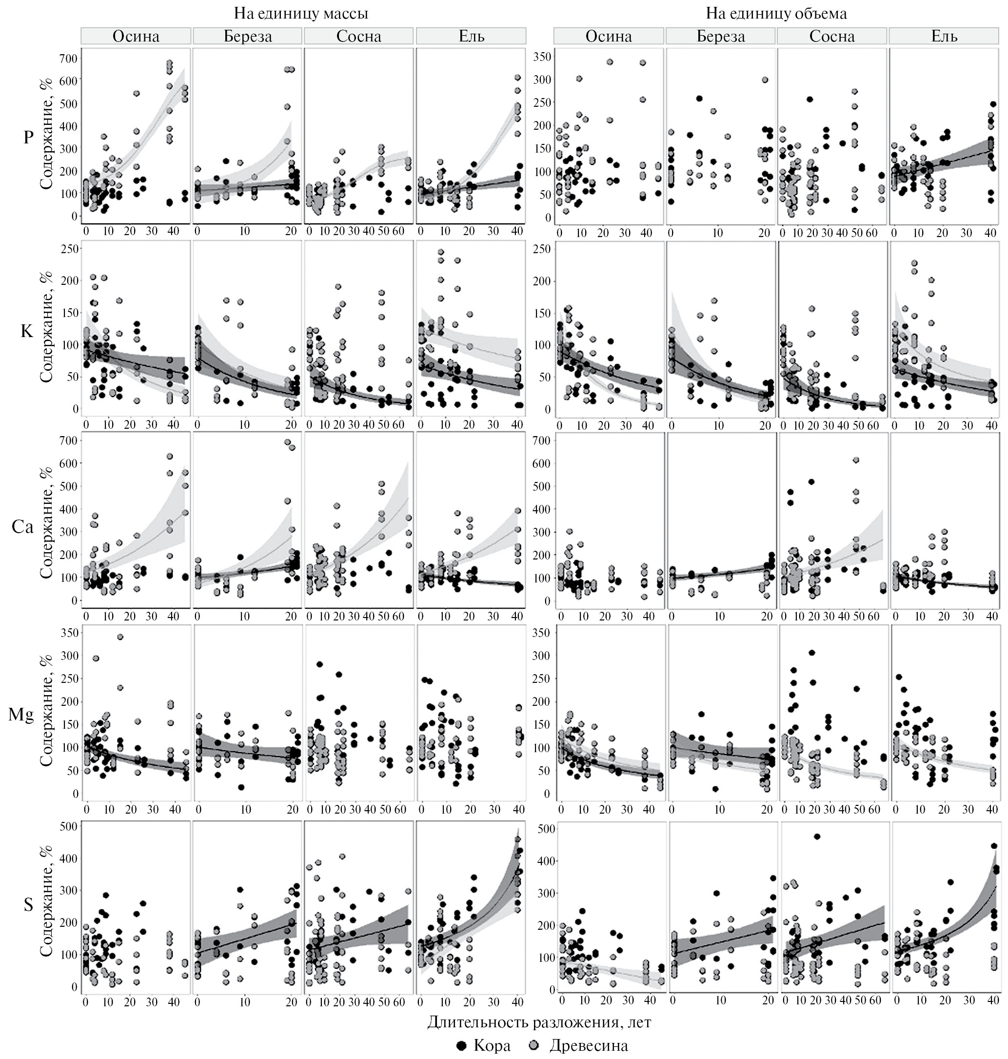 Динамика запасов рассматриваемых макроэлементов в древесине была более разнообразной по сравнению с таковой, наблюдаемой в коре валежа. Накопление Р имело видоспецифичный характер: в стволах березы и ели запасы этого элемента возрастали, в то время как у осины и сосны они оставались без значимых изменений. Мы предполагаем, что видоспецифичность накопления Р обусловлена различным составом ксилофильных организмов, использующих в качестве субстрата и среды обитания валеж определенных древесных пород, степени разложения и, как следствие, элементного состава (Fillipiak et al., 2016). Запасы других макроэлементов либо значимо не изменялись, либо уменьшались с различной скоростью, причем у лиственных пород интенсивность потери была выше по сравнению с таковой у хвойных.