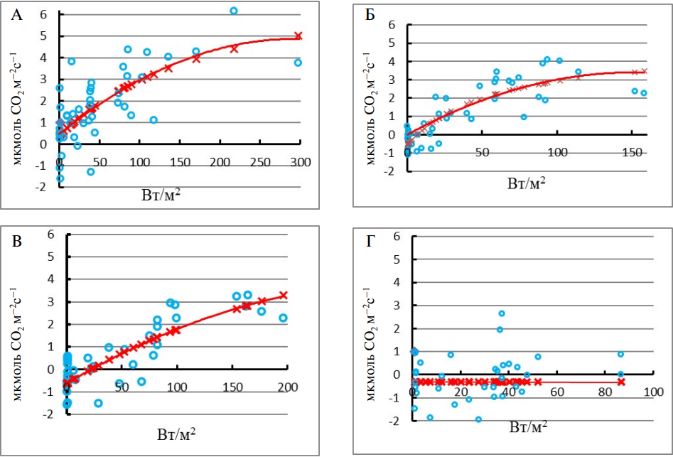 Рис. 1. Зависимость интенсивности фотосинтеза хвои сосны текущего года от солнечной радиации под пологом леса в разных условиях водообеспечения: А – ПВПЛ = –1.0 МПа; Б – ПВПЛ = –1.2 МПа; В – ПВПЛ = –1.5 МПа; Г – ПВПЛ = –2.2 МПа. (Символ круг – экспериментальные значения; символ крест – расчетные значения).