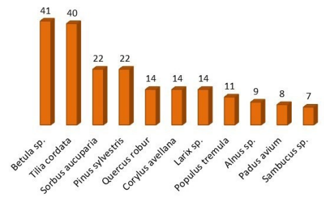 Приуроченность связанных с древесным субстратом видов к определенным форофитам в Серебряноборском лесничестве выглядит следующим образом (рис. 2). Наибольшим видовым богатством лихенобиоты характеризуются кора березы и липы (Tilia cordata Mill.), почти в два раза менее разнообразен состав эпифитного лихенопокрова сосны и рябины (Sorbus aucuparia L.). Одинаковое и сравнительно небольшое количество эпифитных лишайников выявлено на коре дуба (Quercus robur L.), лещины (Corylus avellana (L.) H. Karst.) и лиственницы (Larix sp.), посадки которой эпизодически встречаются в пределах лесничества. В лихенопокрове нескольких неучтенных в диаграмме форофитов (клен (Acer sp.), ива (Salix sp.), ель европейская (Picea abies (L.) H. Karst.), конский каштан обыкновенный (Aesculus hippocastanum L.)) насчитывается от 1 до 5 видов.