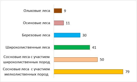 Наибольшим разнообразием лихенобиоты отличаются преобладающие по площади сосновые леса (включая сосняки с участием мелколиственных пород), меньшее количество видов лишайников отмечено в смешанных (сосняки сложные с участием широколиственных пород) и широколиственных лесах (рис. 3).