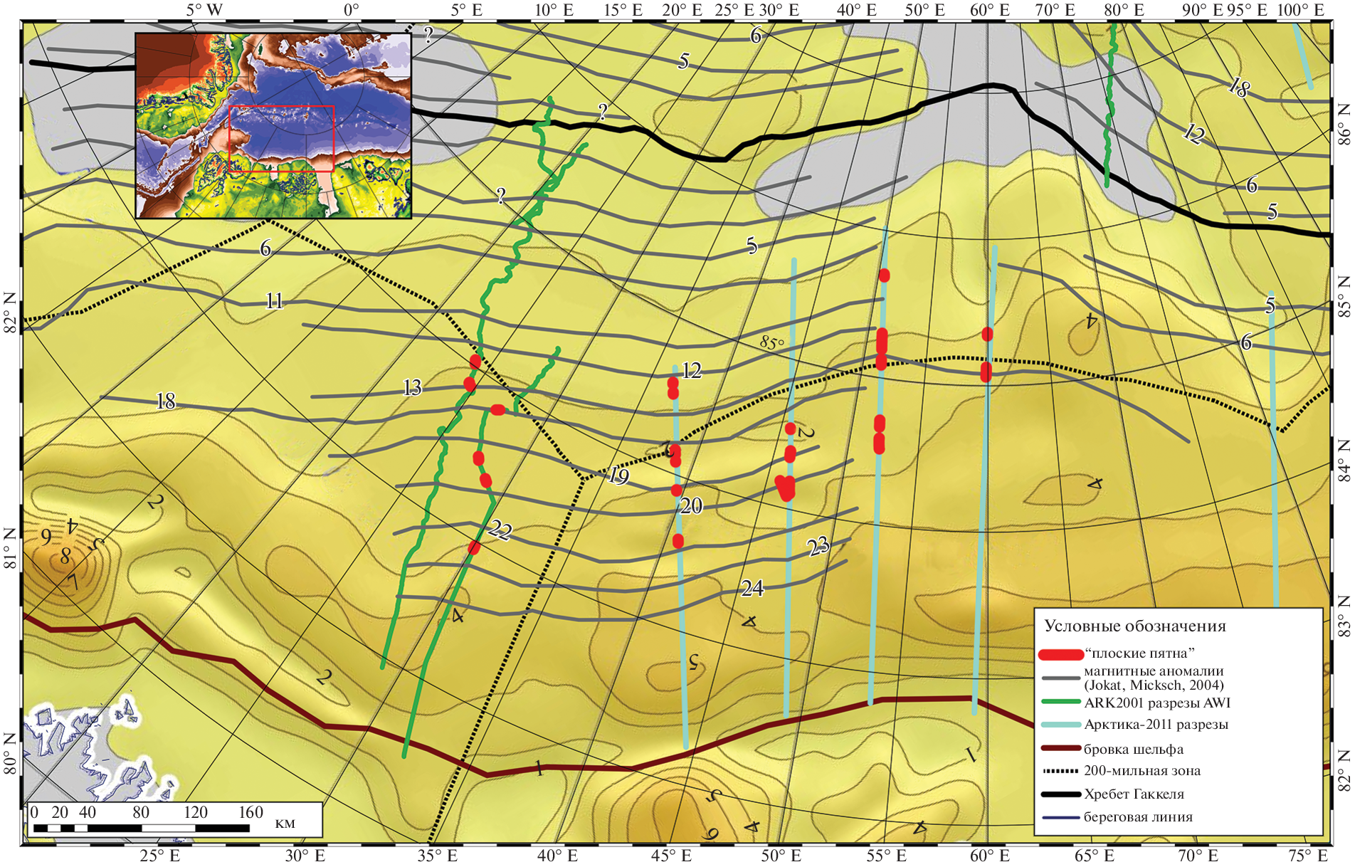 - Jokat W., Weigelt E., Kristoffersen Y. et al. New geophysical results from the south-western Eurasian Basin (Morris Jesup Rise, Gakkel Ridge, Yermak Plateau) and the Fram Strait // Geophys. J. Int. 1995. V. 123. P. 601–610.