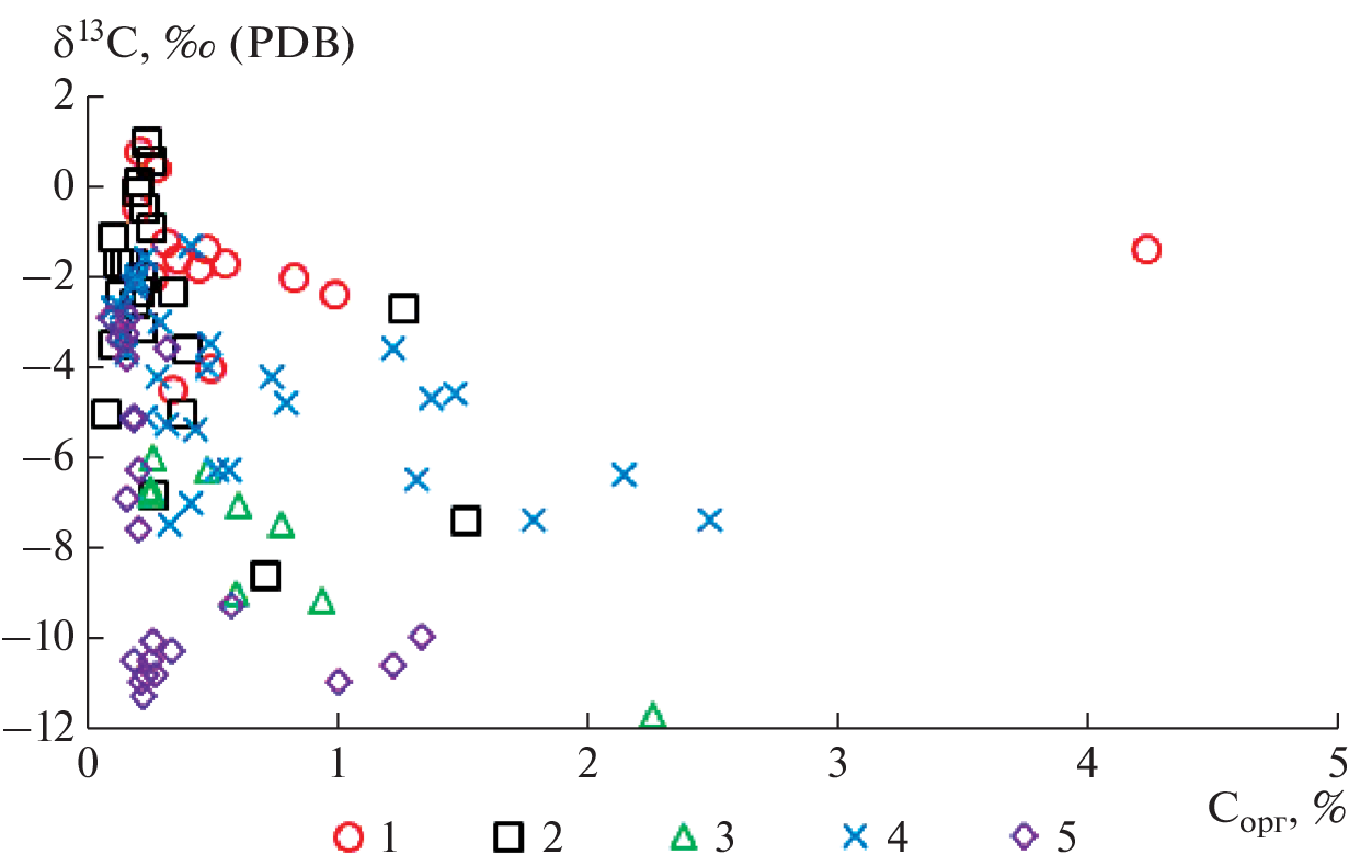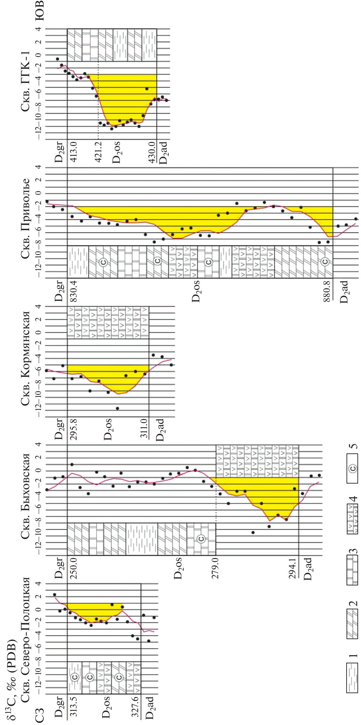 The complex interpretation of distribution of δ13C and δ18О in carbonates, δ34S and 87Sr/86Sr in gypsum from the Osveya horizon (Lower Eifelian) on the territory of Belarus showed that significance of diagenetic isotope signals is low and variations of the values can be consistently explained within a sedimentation model. Along with intervals of sections with standard marine δ13C values, there are negative excursions of the parameter (up to –7…–11‰) marking segments of sequence with carbonate-sulphate rocks and smaller scale sulphate manifestations. The excursions correspond to evaporite episodes when the basin shallowed and, probably, dismembered into separate ponds. This led to increasing the role of continental water enriched with soil carbon in the geochemical system of sedimentation due to the land runoff activation and/or shallowing. Continental water could come from for a long time exposed land areas where the Eifelian deposits are absent until now as well as from periodically existing islands. Oxygen isotopic composition does not react to δ13C negative excursions by similar shifts due to the possible absence of significant difference between the δ18О values of atmospheric precipitation, giving rise to land water, and seawater in low latitudes where the territory of Belarus was situated in the Devonian. In 40% of the studied samples, the δ18О values range from –4 to –2‰, corresponding to the Eifelian “plateau” (~–3‰) in the generalized chemostratigraphic curve in the generalized chemostratigraphic curve constructed using calcite of brachiopod shells from several regions of the world. The δ18О values higher than –2‰ (44% of cases), probably, are the result of water evaporation, while figures < –2‰ (16%) which may decrease up to –7.0…–9.5‰ at the peaks of evaporite episodes, are caused by water heating (sometimes very significant) during the basin shallowing. The activation of continental water role accompanying evaporite episodes is supported by the fact that the 87Sr/86Sr ratio in the Osveya horizon gypsum (0.708402–0.708742) is much higher than that of the Eifelian seawater according to a global estimate (0.70772), while δ34S of gypsum (15.5–21.2‰) in more than a half of the analyzed samples is lower than figures characteristic of the Middle Devonian seawater sulphate (19–20‰).