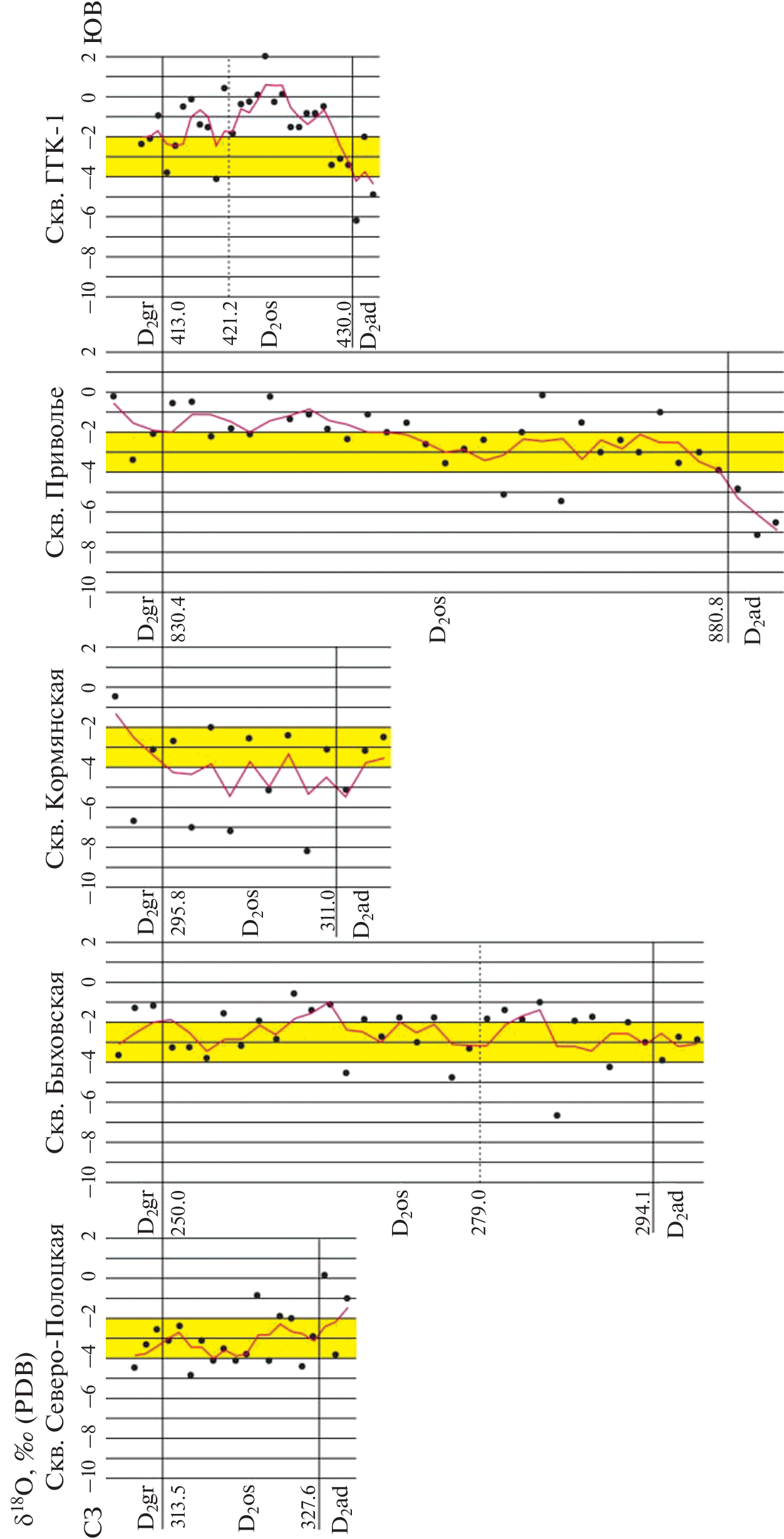 - Махнач А.А., Покровский Б.Г., Стрельцова Г.Д. и др. Вариации изотопного состава углерода и кислорода в нижне-среднедевонских отложениях на юго-западе Воронежской антеклизы // Літасфера. 2021. Т. 2(55). С. 80–94.