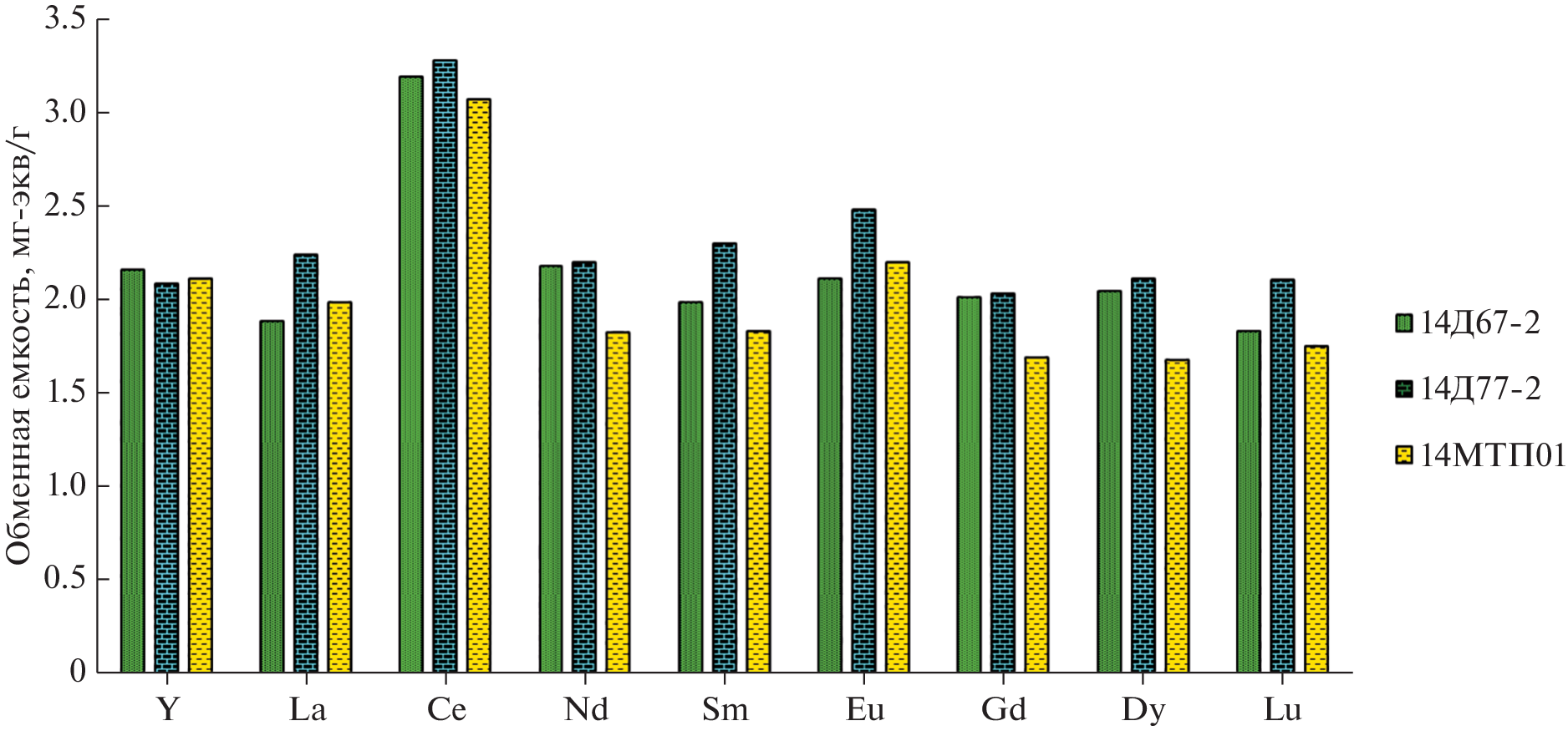 The article presents the results of experimental studies of the sorption properties of ferromanganese crusts (CMC) of Kotzebue guyot relative to rare earth metal cations (REM). It is established that the crusts are a natural highly selective sorbent of REM cations. The sorption of REM cations occurs on ore minerals ‒ Fe-vernadite, vernadite, Mn-feroxigite, goethite. The crusts are characterized by a high exchange capacity – 1.67‒3.28 mg-eq/g, which increases in the series: Lu < Gd < Dy < La, Sm < Nd < Y < Eu) ⪡ Ce. Absorption of REM cations proceeds by an ion-exchange equivalent mechanism, in the case of Ce3+ cations ‒ according to the superequivalent mechanism with respect to the cations of the exchange complex of ore minerals ‒ Na+, K+, Ca2+, Mg2+, Mn2+, Ni2+, which contribute 95–98% to the total capacity of minerals.