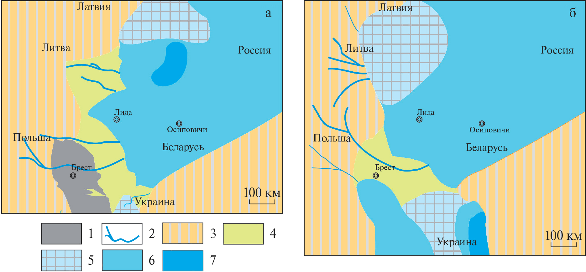 1 – Волынско-Брестская КМП; 2 – предполагаемое положение речных артерий; 3 – область отсутствия осадконакопления; 4 – континентальные фации (русла и пойменные области); 5 – области, периодически заливавшиеся трансгрессировавшим морем; 6 – приливно-отливные равнины; 7 – бассейновые фации.