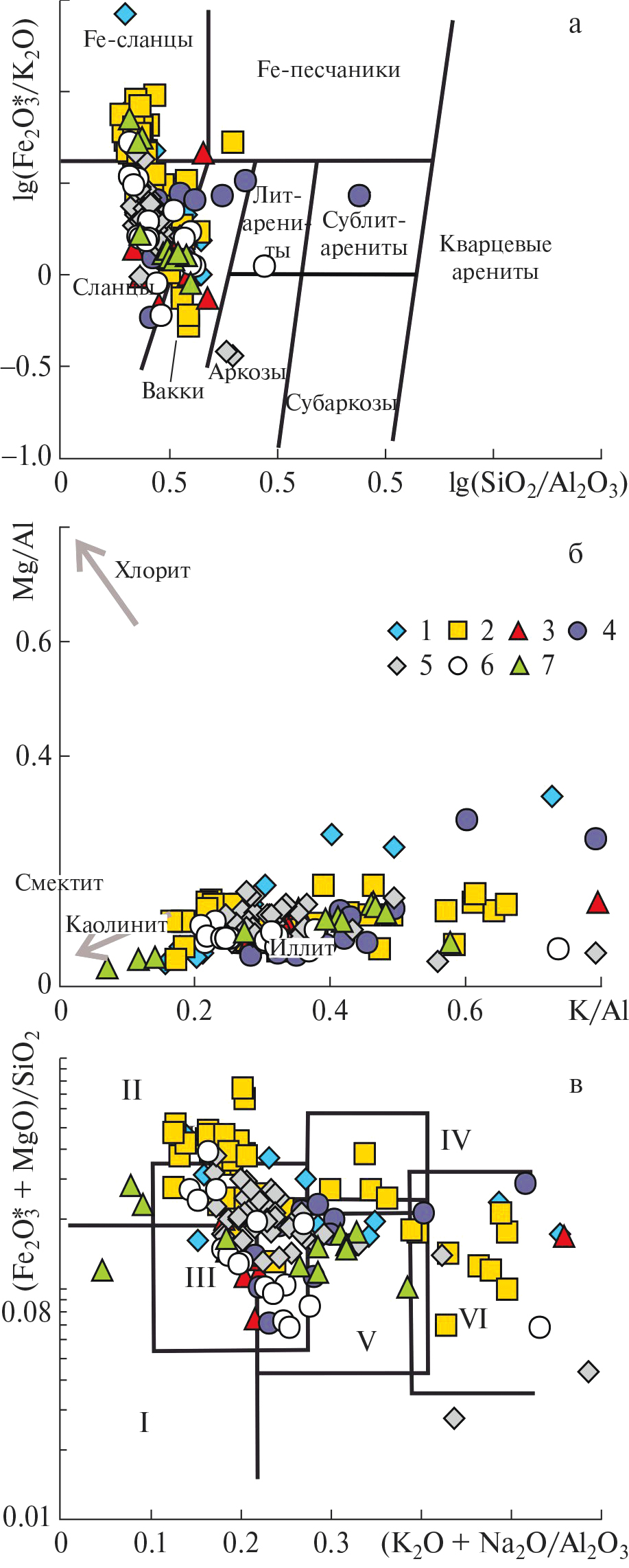 Рис. 4. Положение фигуративных точек состава глинистых пород Западной Беларуси и Волыни (1 – волынский этап, 2 – редкинский этап, 3 – котлинский этап, 4 – нижний кембрий), Восточной Беларуси (5 – редкинский этап, 6 – котлинский этап) и Литвы (7 – котлинский этап) на диаграммах log(SiO2/Al2O3)–log(Fe2O3*/K2O) (а), K/Al–Mg/Al (б) и (K2O+Na2O)/Al2O3–(Fe2O3*+MgO)/SiO2 (в)
