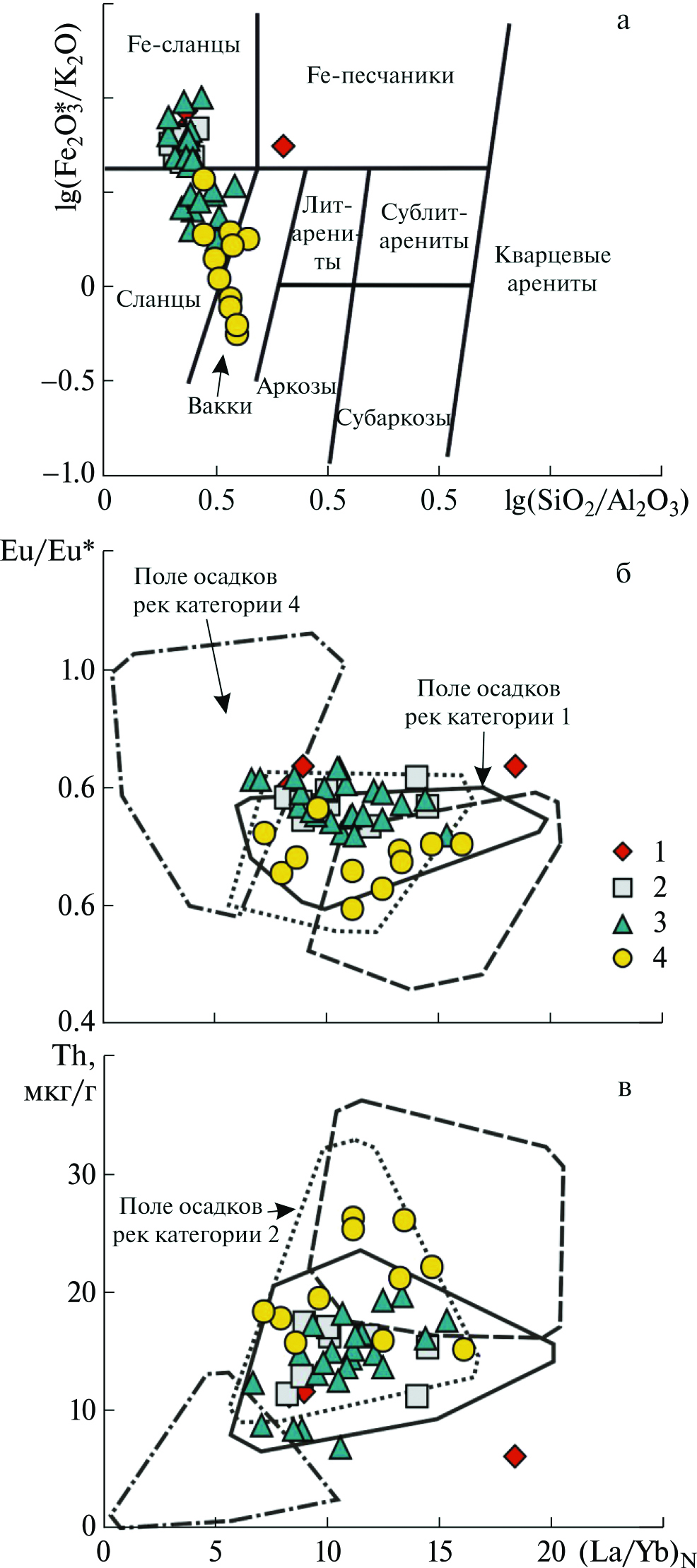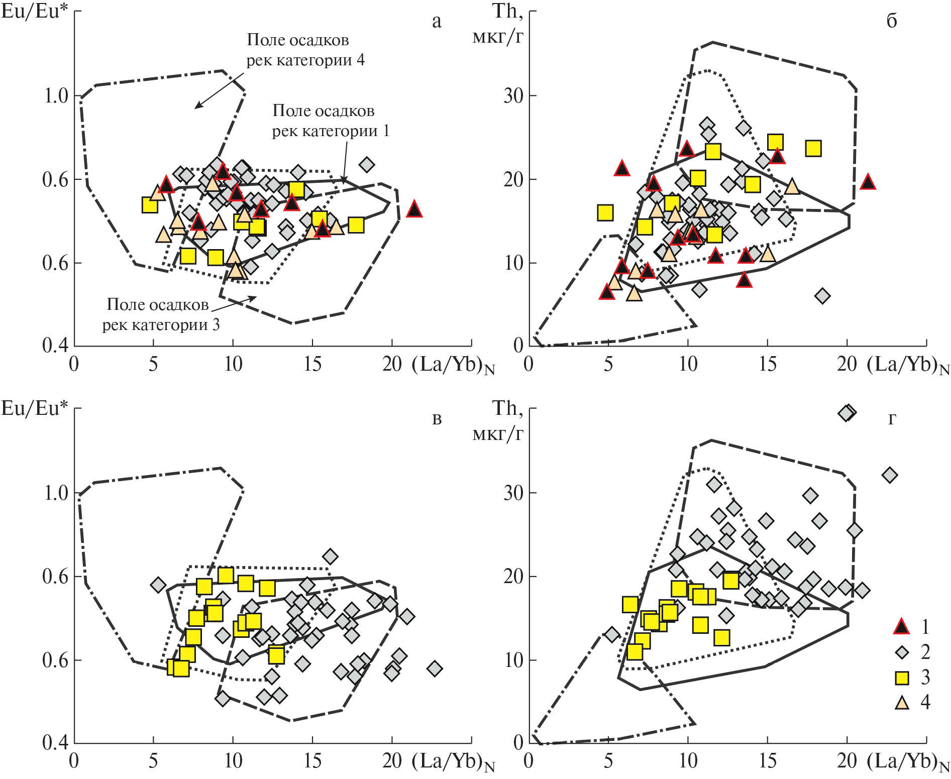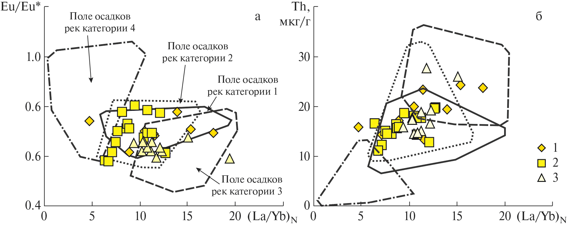 Ранее нами были предложены диаграммы (La/Yb)N–Eu/Eu*, (La/Yb)N–Th и (La/Yb)N–(Eu/Sm)N [Маслов и др., 2017; Маслов, 2019; Маслов, Шевченко, 2019], на которых по данным из публикации [Bayon et al., 2015] показаны поля состава тонкозернистых донных осадков устьевых частей современных рек разных категорий: 1) крупных рек (World’s major rivers), т. е. рек с площадью водосборного бассейна более 100 000 км2; 2) рек, дренирующих осадочные образования (rivers draining “mixed/sedimentary“ formations), площадь водосборного бассейна которых составляет менее 100 000 км2; 3) рек, питающихся продуктами размыва магматических/метаморфических террейнов (rivers draining igneous/metamorphic terranes); 4) рек, дренирующих вулканические провинции (rivers draining volcanic rocks). Различные аспекты использования этих диаграмм рассмотрены в публикациях [Маслов, 2020; Маслов, Подковыров, 2021а, 2021б, 2021в и др.] на примерах осадочных толщ дорифея, рифея и венда, а также палеозоя и мезозоя.