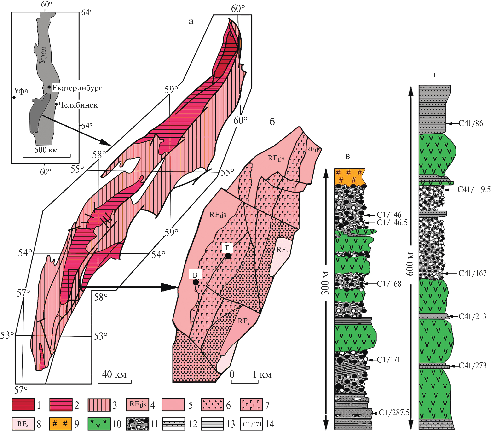 1 – архей-протерозойские отложения нерасчлененные, 2 – нижнерифейские отложения нерасчлененные, 3 – среднерифейские отложения нерасчлененные, 4 – юшинская свита, 5 – нерасчлененные отложения зигазино-комаровской и авзянской свит, 6 – зигальгинская свита, 7 – машакская свита, 8 – верхнерифейские отложения нерасчлененные, 9 – риодациты, 10 – базальты, 11 – конгломераты, 12 – песчаники, 13 – сланцы, алевросланцы, 14 – точки отбора проб.
